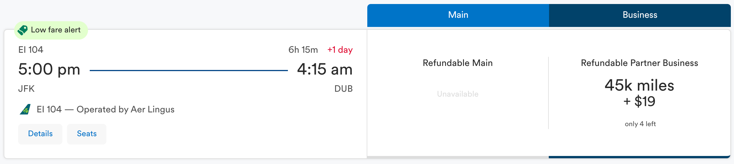 For instance, you could book a nonstop business-class ticket from New York to Dublin on Aer Lingus in January 2025 for only 45,000 Alaska miles plus $19 in taxes and fees. With the current sale, you could purchase all the miles you'd need from Hawaiian Airlines for just $575, for a total of $594. That's an excellent deal, considering cash rates for this ticket start at $4,703.