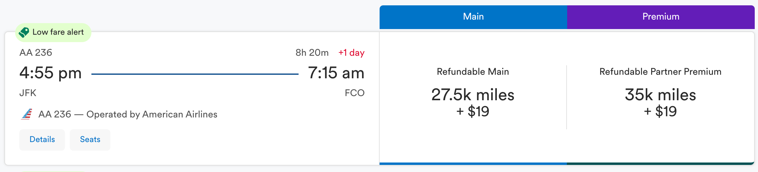You could also book a premium economy seat from New York to Rome for only 35,000 miles and $19 each way. Purchasing the 35,000 miles required to book this ticket would cost you $457.20.