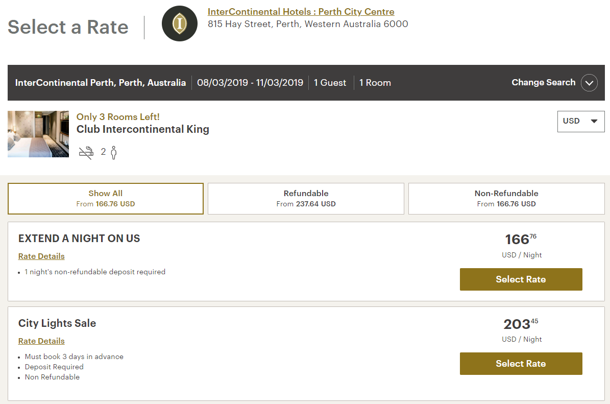 While the rate is based on the Best Flexible Rate, a deposit for one night of the stay is charged at the time of booking. This is non-refundable in the event of cancellation or no-show. Plus, this promotion provides a hefty discount off of even other promotion rates. For example, at the InterContinental Perth City Centre, the ongoing City Lights sale discounts the $238 per night Best Flexible Rate to a nonrefundable $203 per night. However, the third-night free promotion makes it a lot more affordable with a smaller deposit:
