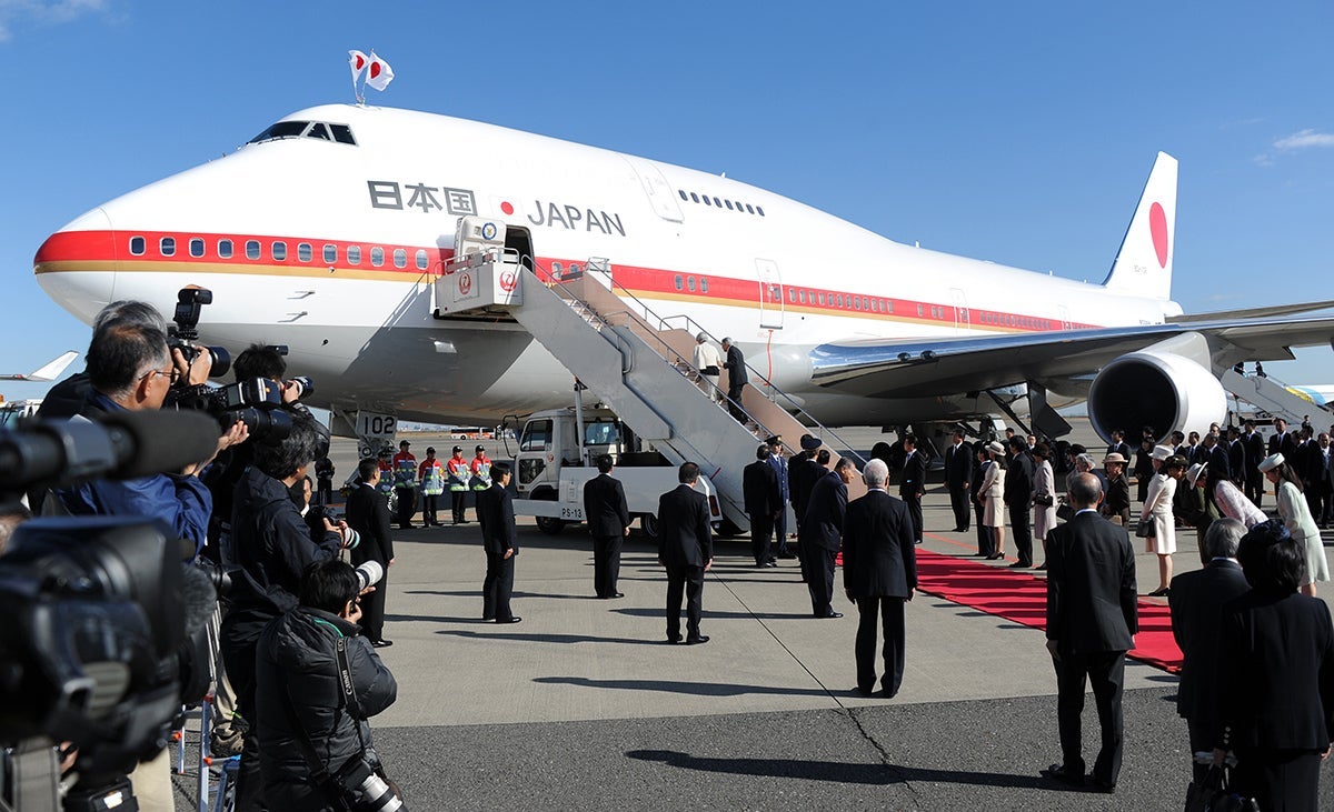 Japanese Emperor Akihito and Empress Michiko board one of the VIP 747s at Haneda Airport in Tokyo on November 30, 2013, on the way to India for the first-ever official visit there by a Japanese emperor. (Toru Yamanaka/AFP/Getty Images)