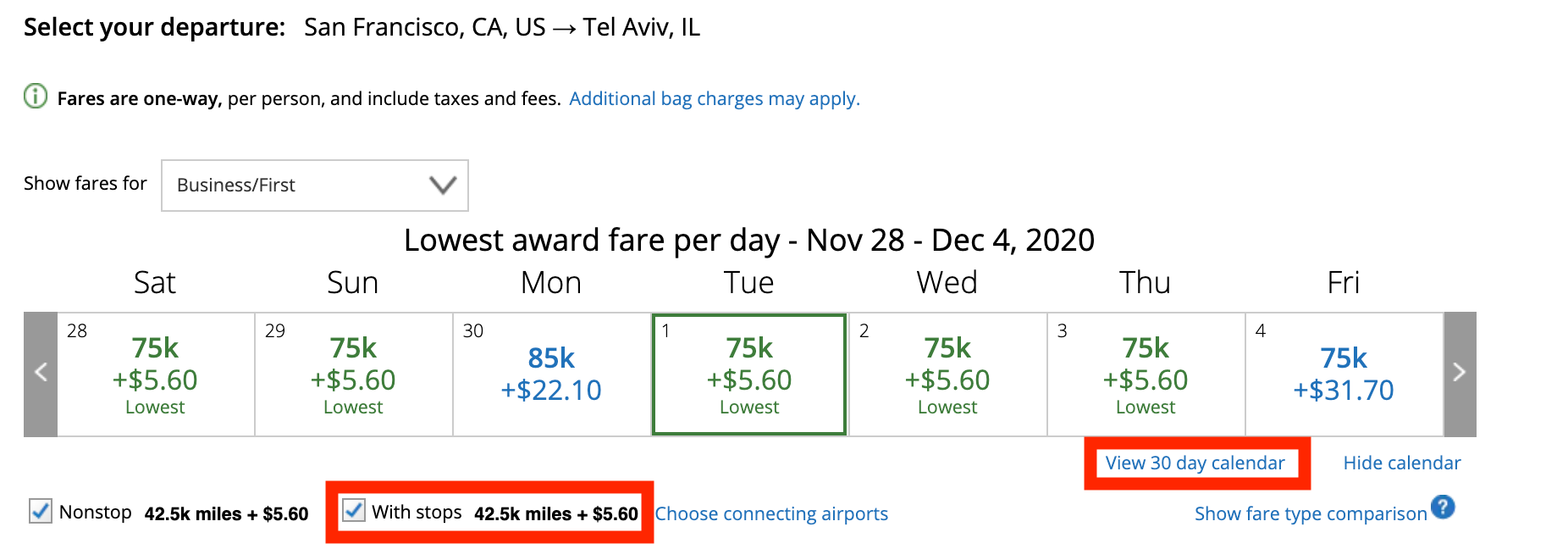 This is a great question Nancy, and the exact answer ultimately depends on what airline you want to fly. All three of the legacy U.S. airlines — Delta, United and American — allow you to search a calendar view on their website, and you can even filter for nonstop travel. Since United is the only airline that flies nonstop from San Francisco (SFO) to Tel Aviv (TLV), we'll use its website as an example.