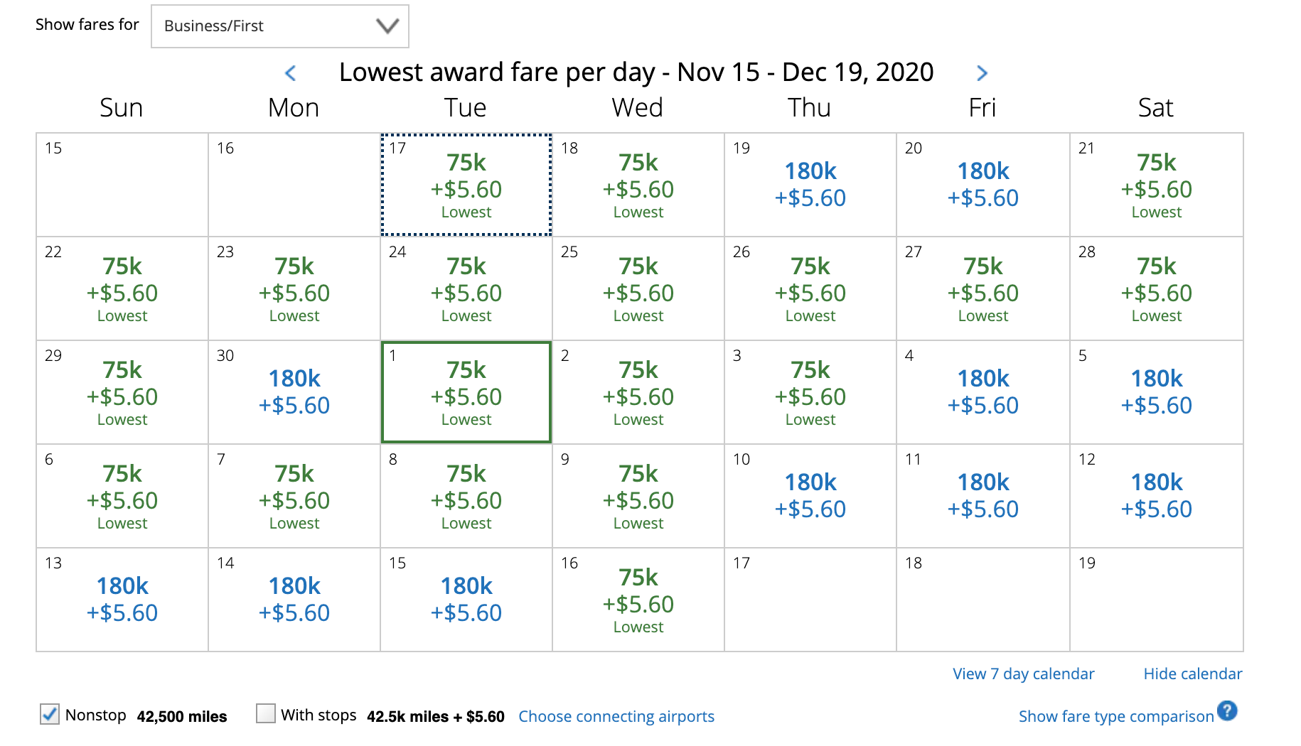 From there, you can see the entire monthly calendar view, and the good news for Nancy is that there's plentiful award space on United's nonstop flight in December. This flight is even operated by a Boeing 777-200LR aircraft featuring true United Polaris seats.