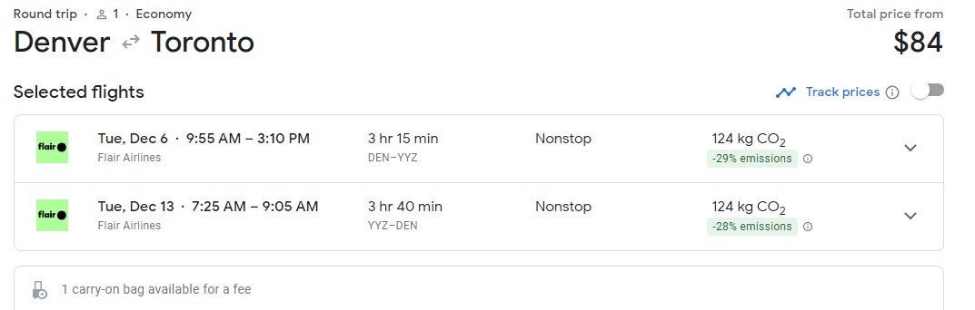 Comparable tickets from United and Air Canada for a similar date cost more than $400. So, even with added surcharges for carry-on bags, this Denver-to-Toronto fare is a huge savings over the major carriers.
