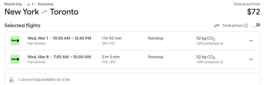 If you're looking for spring 2023, you can find $72 round-trip tickets between New York and Toronto. Carry-on bag fees will apply, but this flight offers significant savings versus United and Air Canada fares on the same route.