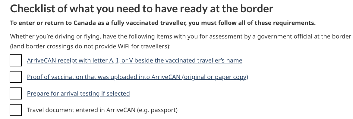 This is the only step vaccinated travelers must take prior to traveling to Canada because fully vaccinated individuals no longer need to submit a predeparture test to enter as of April.