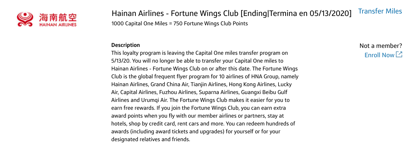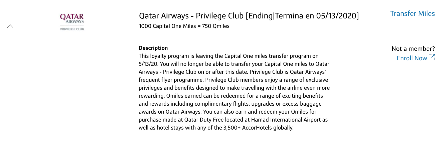 However, as noted by Doctor of Credit and confirmed by a Capital One spokesperson, the rewards program will be losing two of its transfer partners, effective May 13, 2020. The partners you will no longer be able to transfer to are Qatar Airways' Privilege Club and Hainan Airlines' Fortune Wings Club.