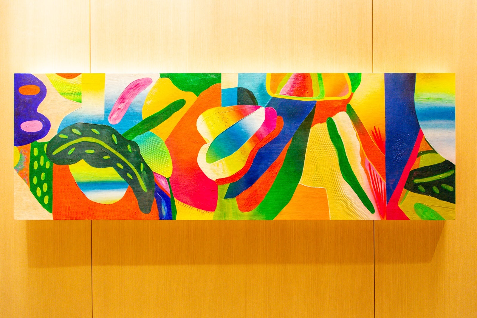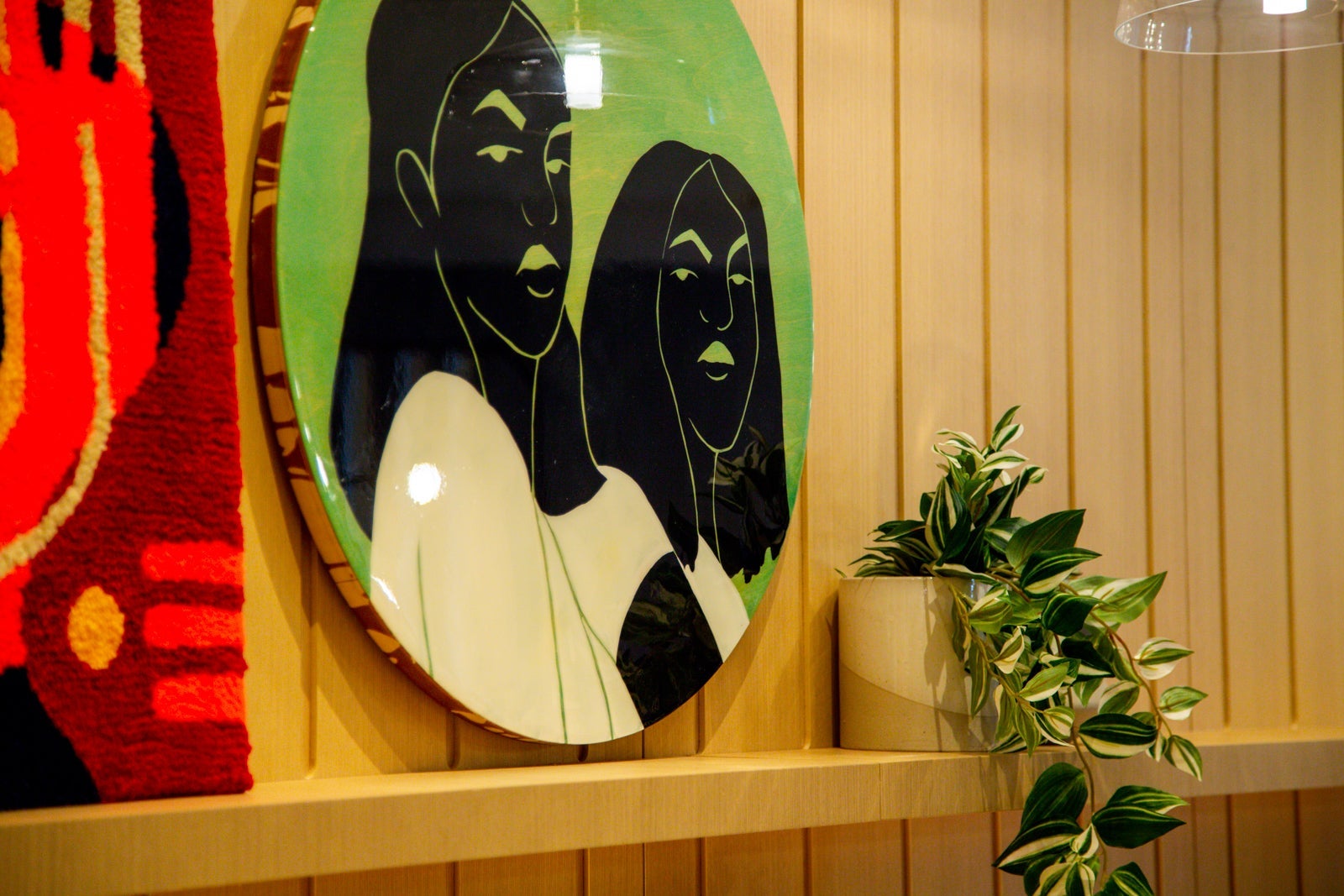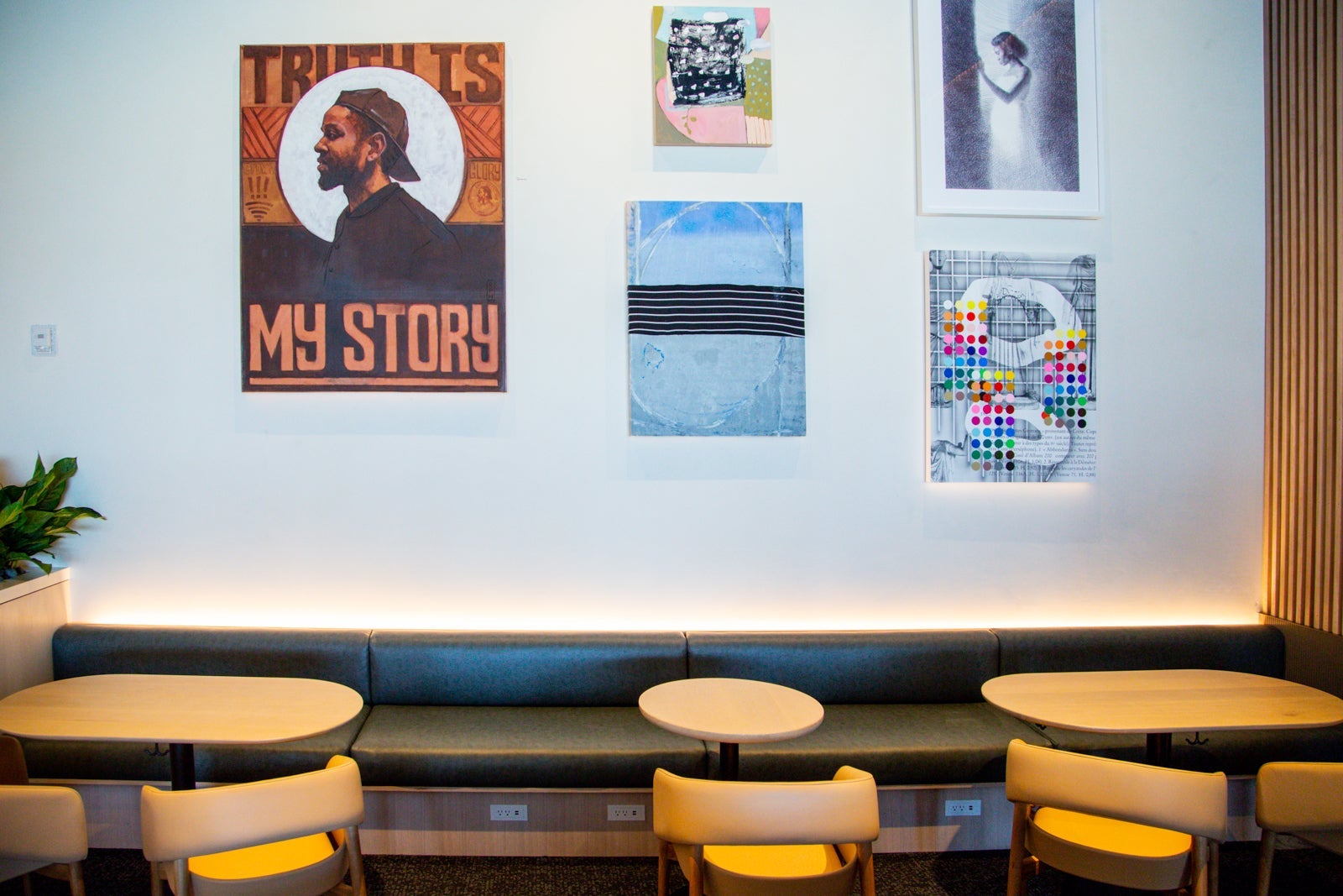 One of the first details of the lounge that you may notice is the pieces of artwork scattered throughout. The Capital One Lounge features more than 55 pieces of original art by local artists from the region. Curated by The Tappan Collective, the collection includes a variety of compositions from wood to acrylic to silkscreen prints and more.