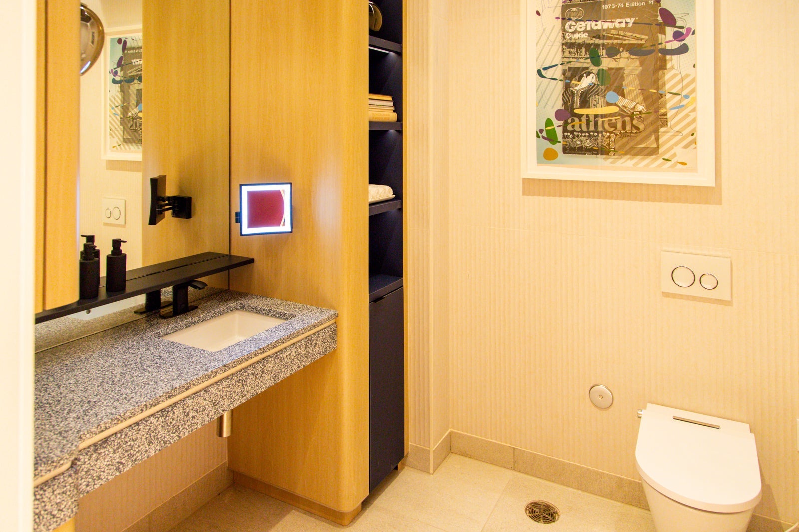 A separate corridor near the lounge entrance houses the four individual restrooms, each fully stocked with hand soap, hand lotion, cloth towels and even bidets.