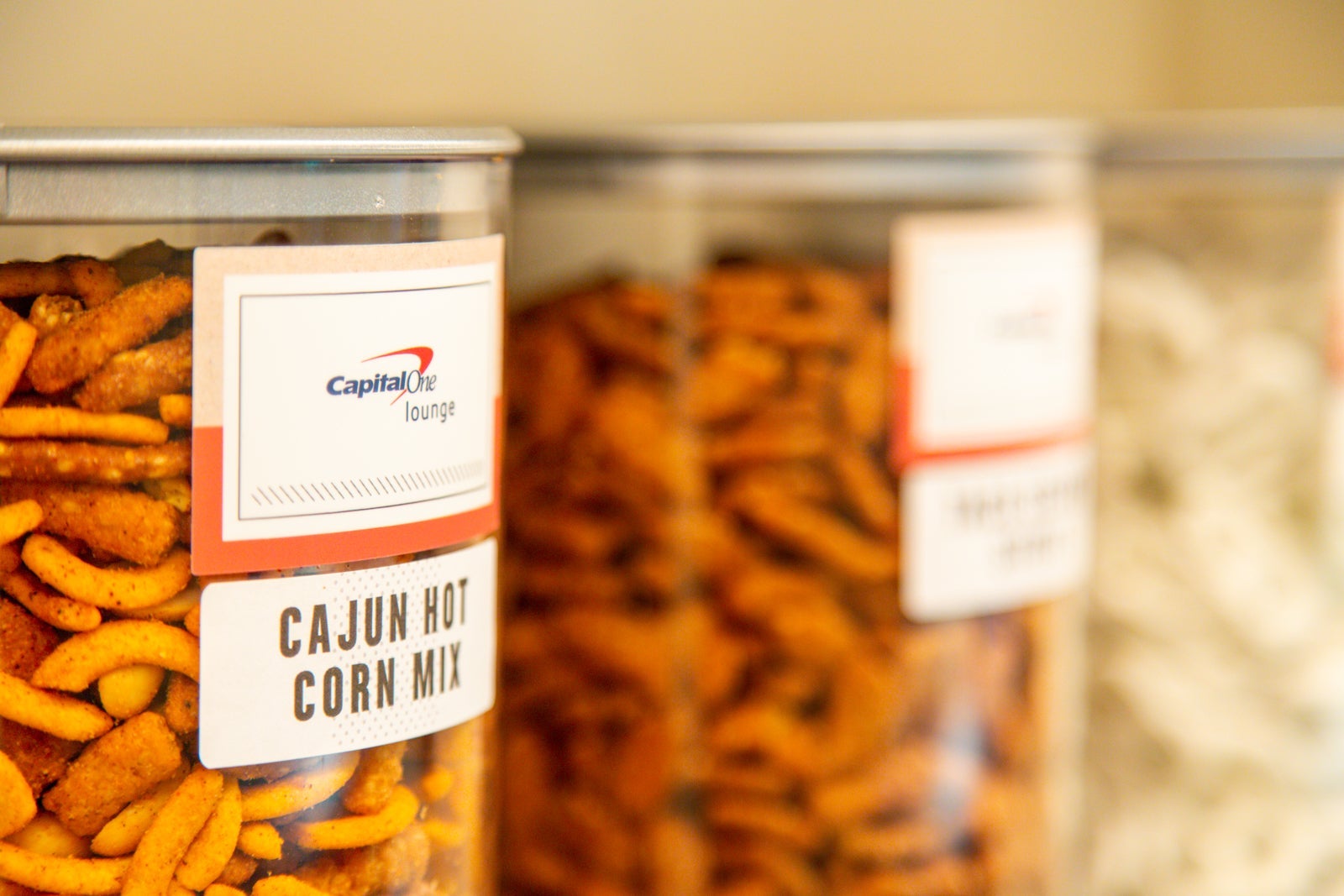 Capital One purposely built this grab-and-go space for frequent travelers that may not have time to sit down for a full meal, though the individually wrapped items are also a plus in the pandemic era with its focus on hygienic offerings.