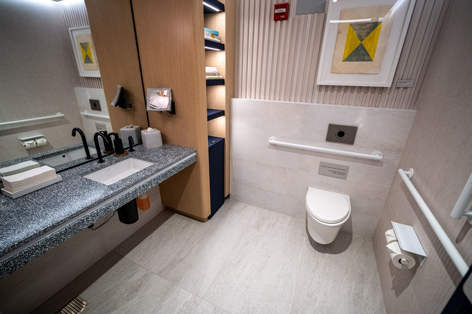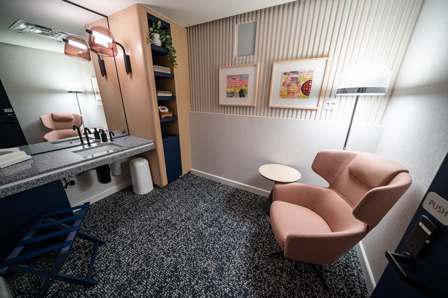 Finally, down a parallel hallway running down the middle of the lounge's interior are four private bathrooms, along with a parents room that can be used for nursing or changing babies. The room was missing a changing table during the preview; a Capital One representative said it would be installed before the lounge opens to the public.