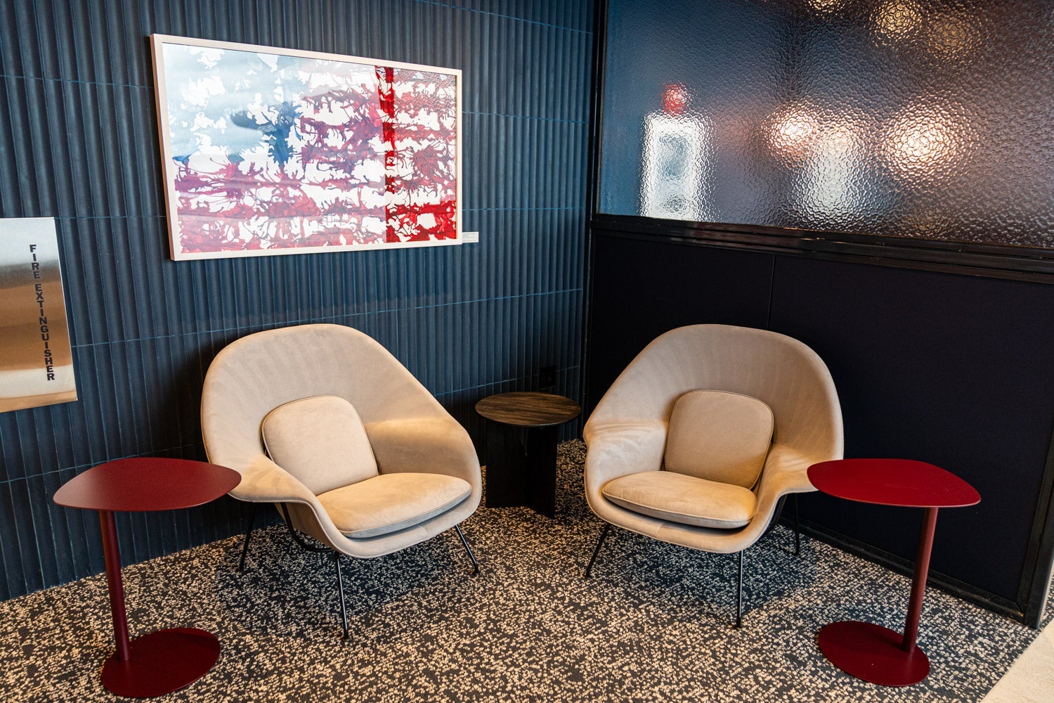 Down the hall to the right, a few seating areas line up against the windows. There are several different types of communal seating, staged at various levels, making for a sunken living room vibe — tres retro chic. While not roped off just for families, this area is created with families and children in mind, with lower stools and ample outlets for recharging devices.