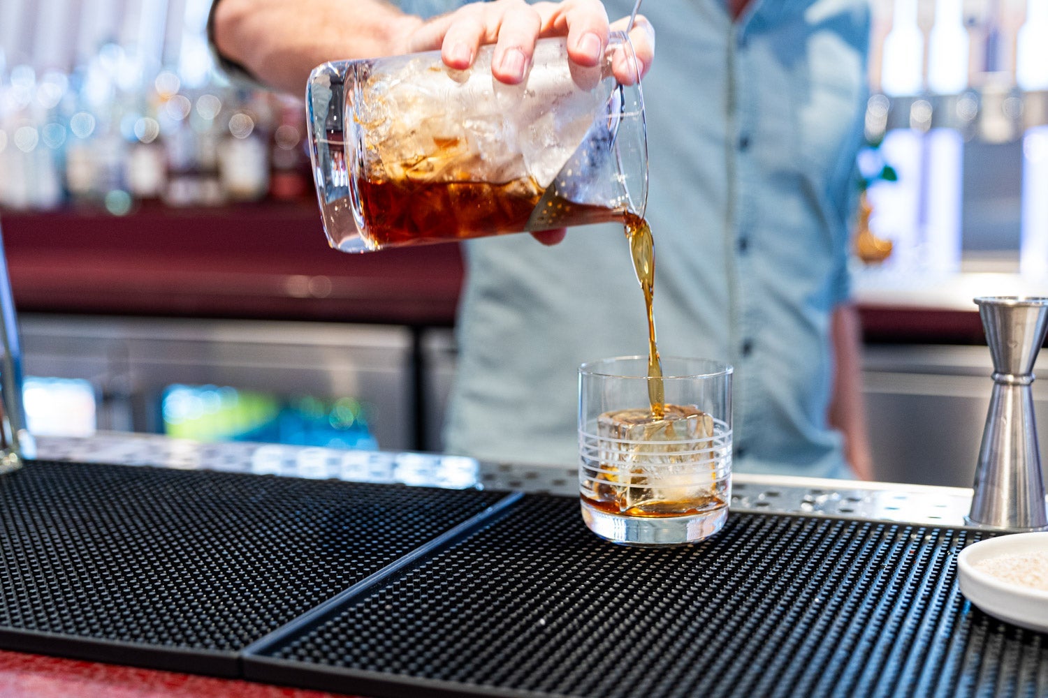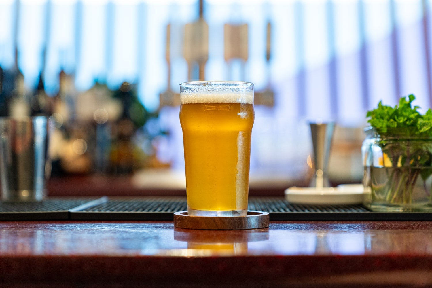 Up at the bar, a wide variety of drinks is available, including custom beer and cocktails designed by local mixologists.