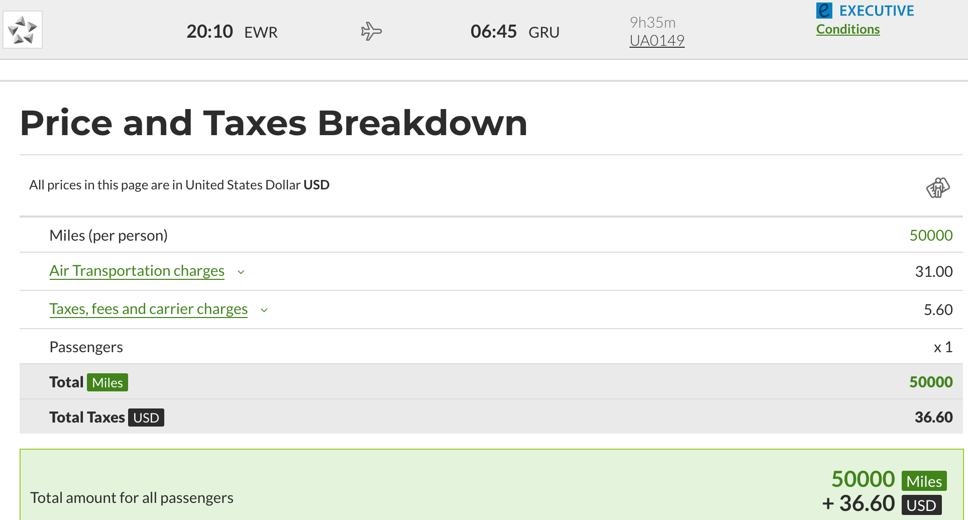 For example, you can fly one-way from Newark (EWR) to Sao Paolo, Brazil (GRU), in United Polaris business class for 50,000 miles and $36.60 in taxes and fees. You will need to search for saver business-class availability with United.