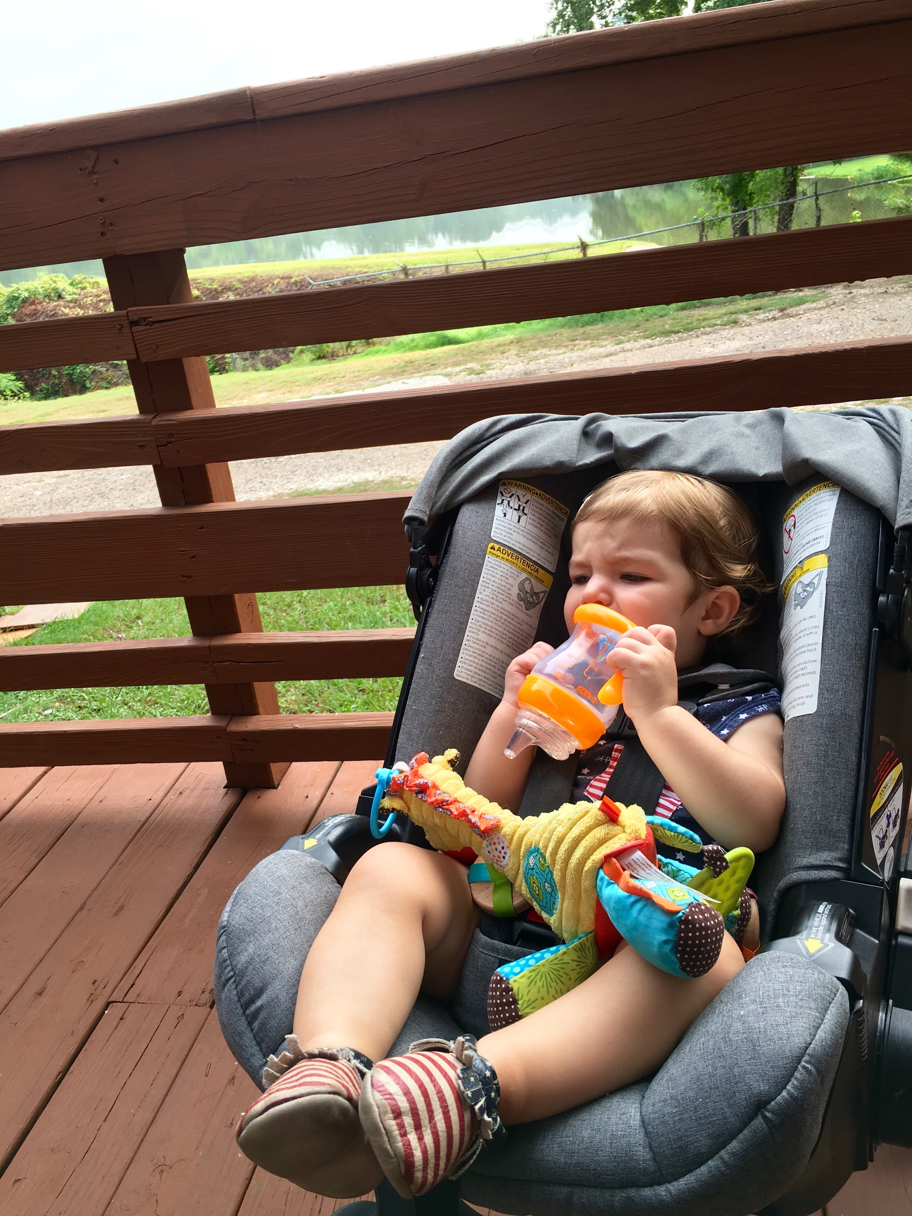 But, our baby is now a one year old (almost) toddler, and the Doona is officially maxed out. She still fits in it technically, but not only is she pushing the upper limit for the size limits, but it increasingly is not ideal for a stroller because she literally dangles out of it, and it isn't a fully upright ride. In other words, it still works for short trips around town, but it sadly isn't really appropriate for long haul excursions anymore. Sniff, sniff.