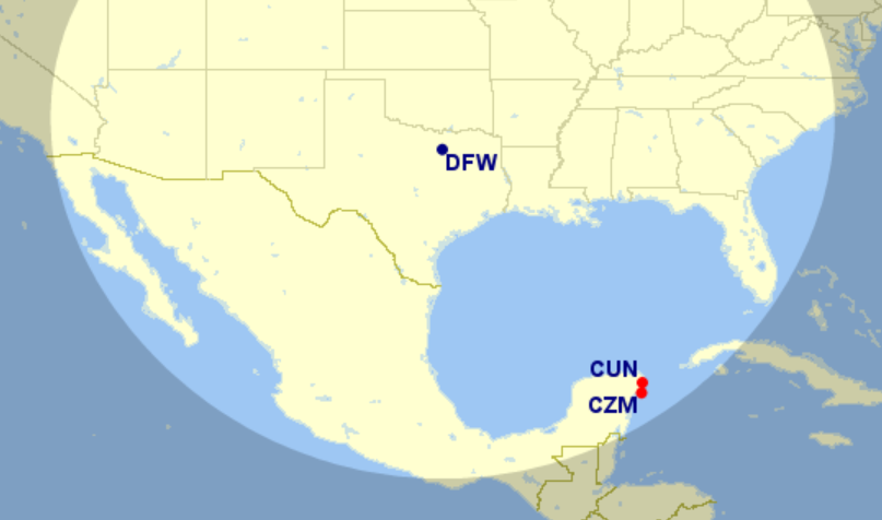 For flights out of Dallas/Fort Worth (DFW), there are two options to the Caribbean. Both Cancun and Cozumel, Mexico are just inside the 1,151 mile band.