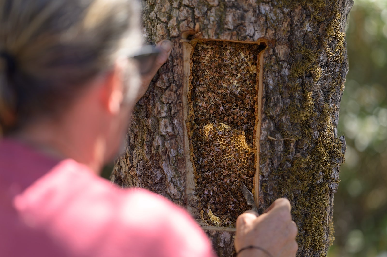 "I don't have a set curriculum; if they have a lot of experience with bees, we will talk at a higher level. If not, we can do more of an introduction," Keller said. "We will walk the grounds, look at the log hives, and try our best to find the queen. Some guests may not be immediately comfortable getting close to a bee colony, but we make sure guests are fully protected."