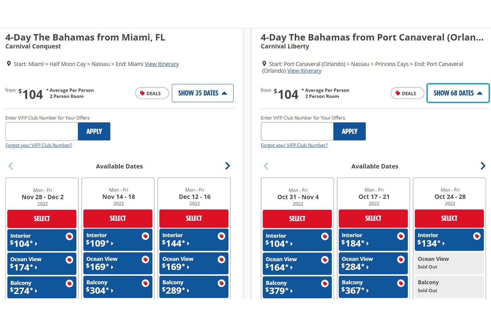 • Four-night Carnival Liberty sailings from Port Canaveral to Nassau and Princess Cays departing on Oct. 31 and Nov. 14, both starting at $104. Additional departures of this itinerary on Oct. 24, Nov. 7, Dec. 5 and Dec. 12 now start at $134 to $139.