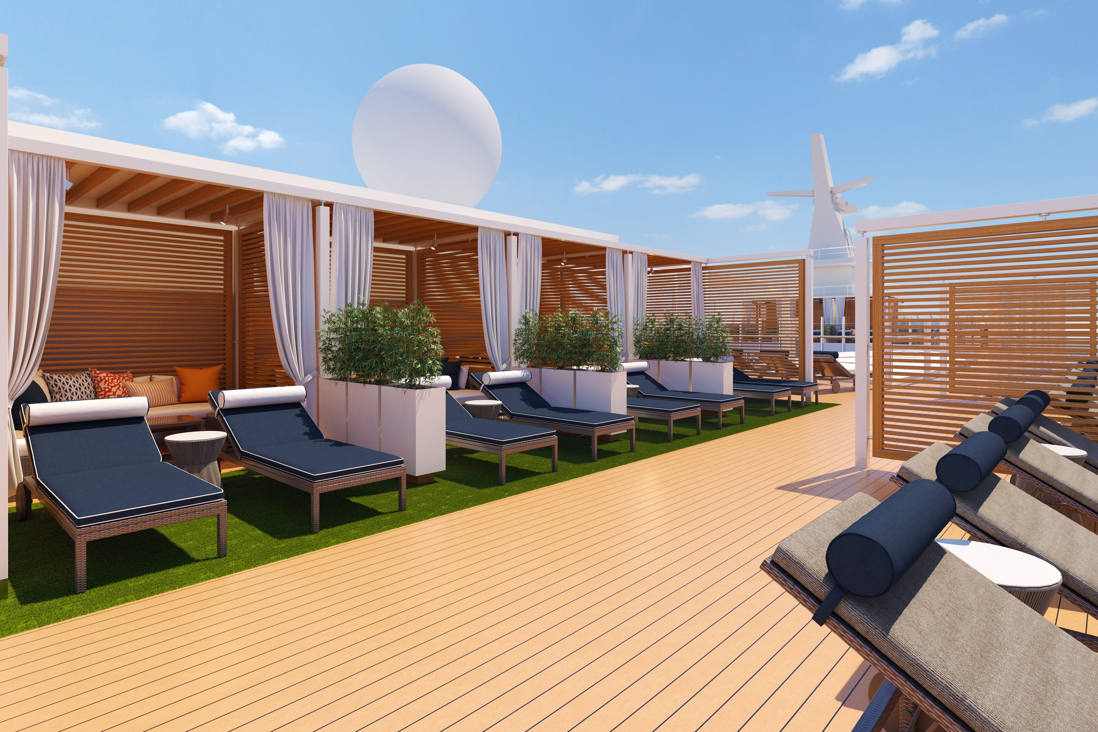 Located at the top of the ship on Deck 17, the complexes will have separate living and sleeping areas as well as the most expansive balconies in the Carnival fleet. Measuring more than 600 square feet, the balconies will feature a lounging area with a large sunbed as well as as a private outdoor hot tub and shower.