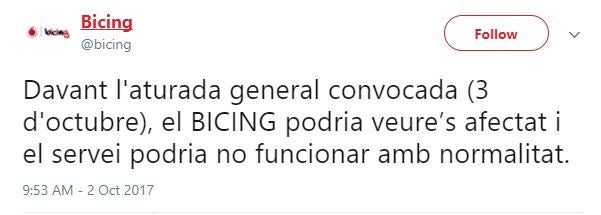 The strike is affecting much more than just air travel Tuesday in Barcelona. Only 25% of metro trains will be operating, so expect crowded trains. Some of the city bike-share program Bicing's stations may be closed and the system may not function normally. The national train service is only providing 76% of the usual high speed rail services/long distance trains in and out of Barcelona and 65% of medium/short distance trains through midnight on October 13. The carrier has also canceled 151 trains between October 3 and 9.