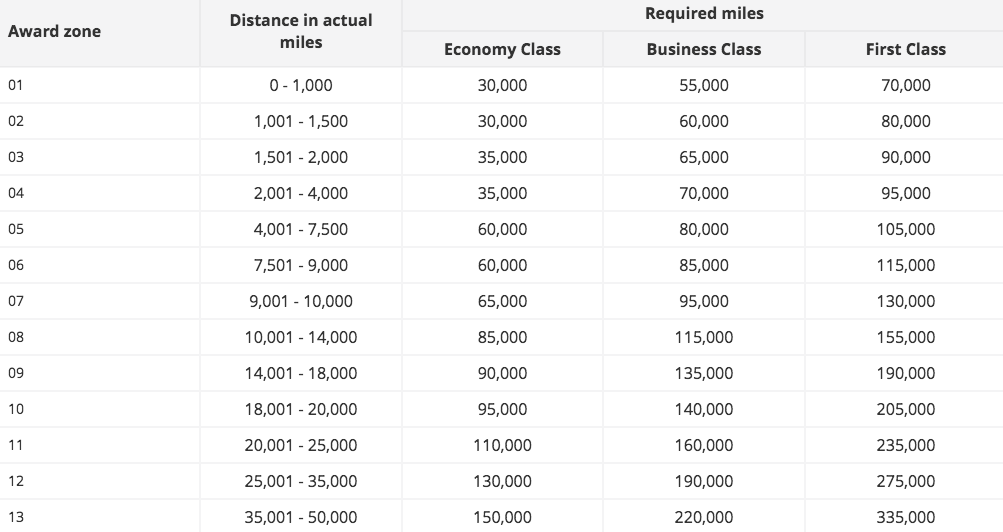 As you can see, long-distance premium cabin awards will require more miles. For instance, Zone 9 awards (covering redemptions from 14,001-18,000 miles in length) will increase from 135,000 miles to 155,000 miles for business class. First class is hit even harder, rising from 190,000 miles to a whopping 250,000 miles. Economy award increases aren't quite as bad, but a number will also require more miles.