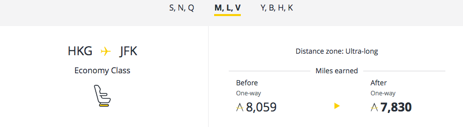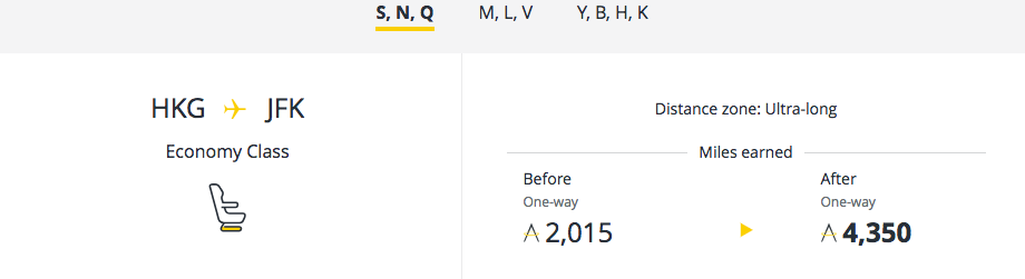 For instance, on the Hong Kong (HKG) to New York (JFK) flight in economy with an S, N or Q fare, you'll earn over 2,000 additional miles with the new system:
