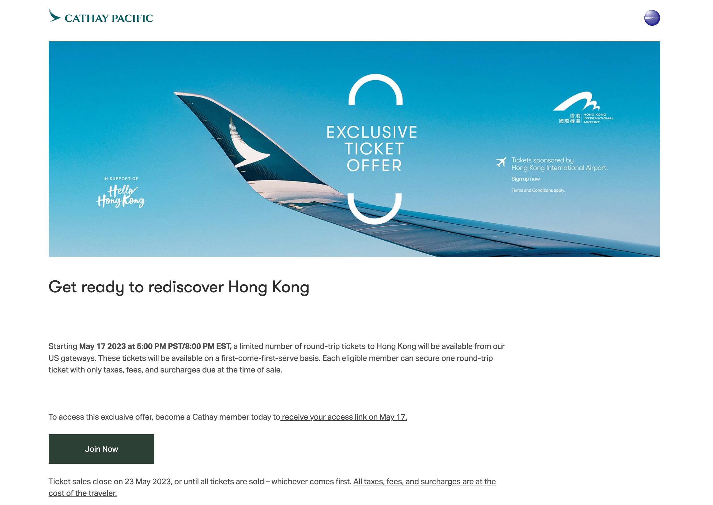 Cathay Pacific has partnered with the Hong Kong tourist board and HKG to offer subsidized tickets to North American passengers. The tickets are in limited supply, but successful applicants will only need to pay for the taxes and surcharges on their tickets. Winners will be informed May 17.