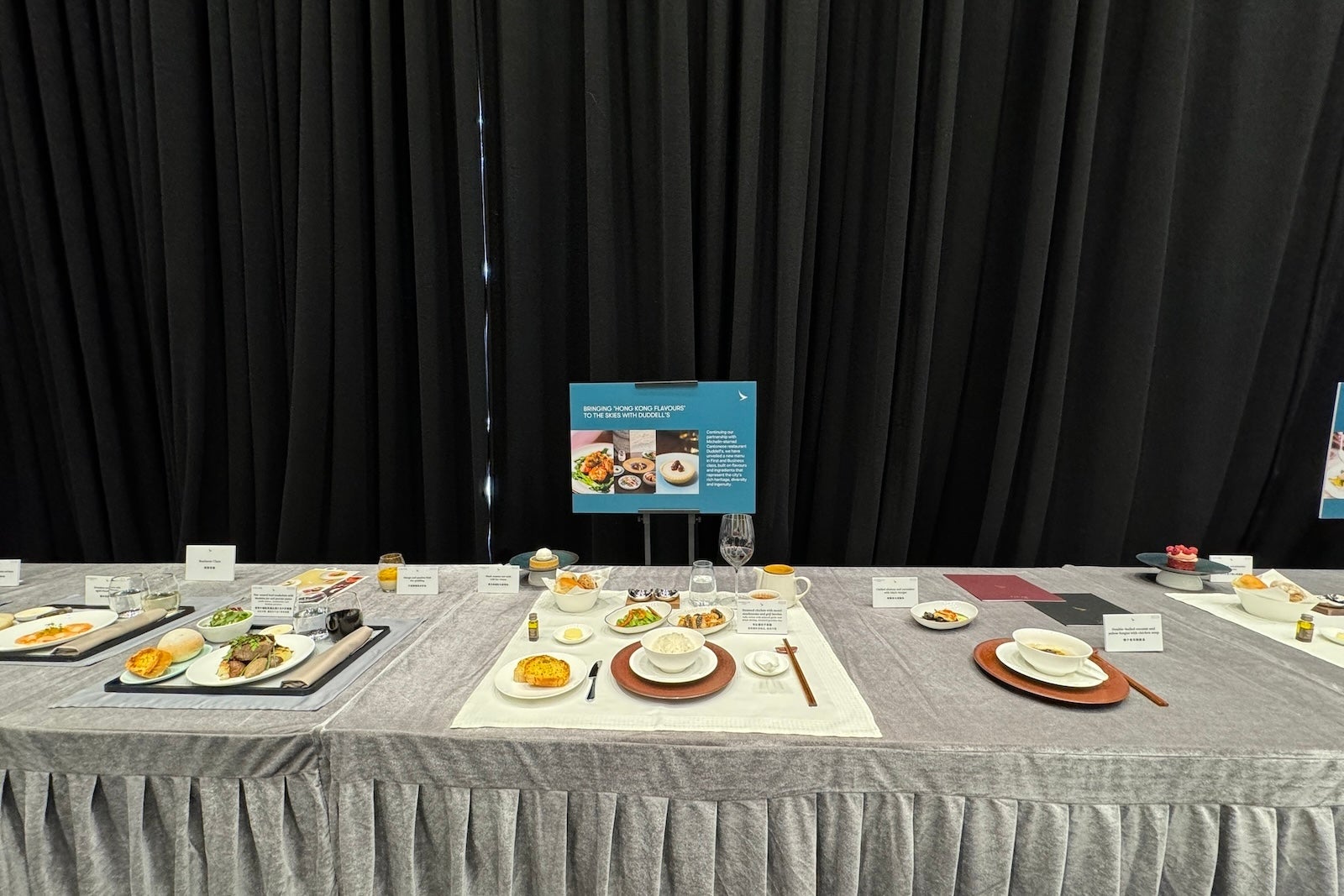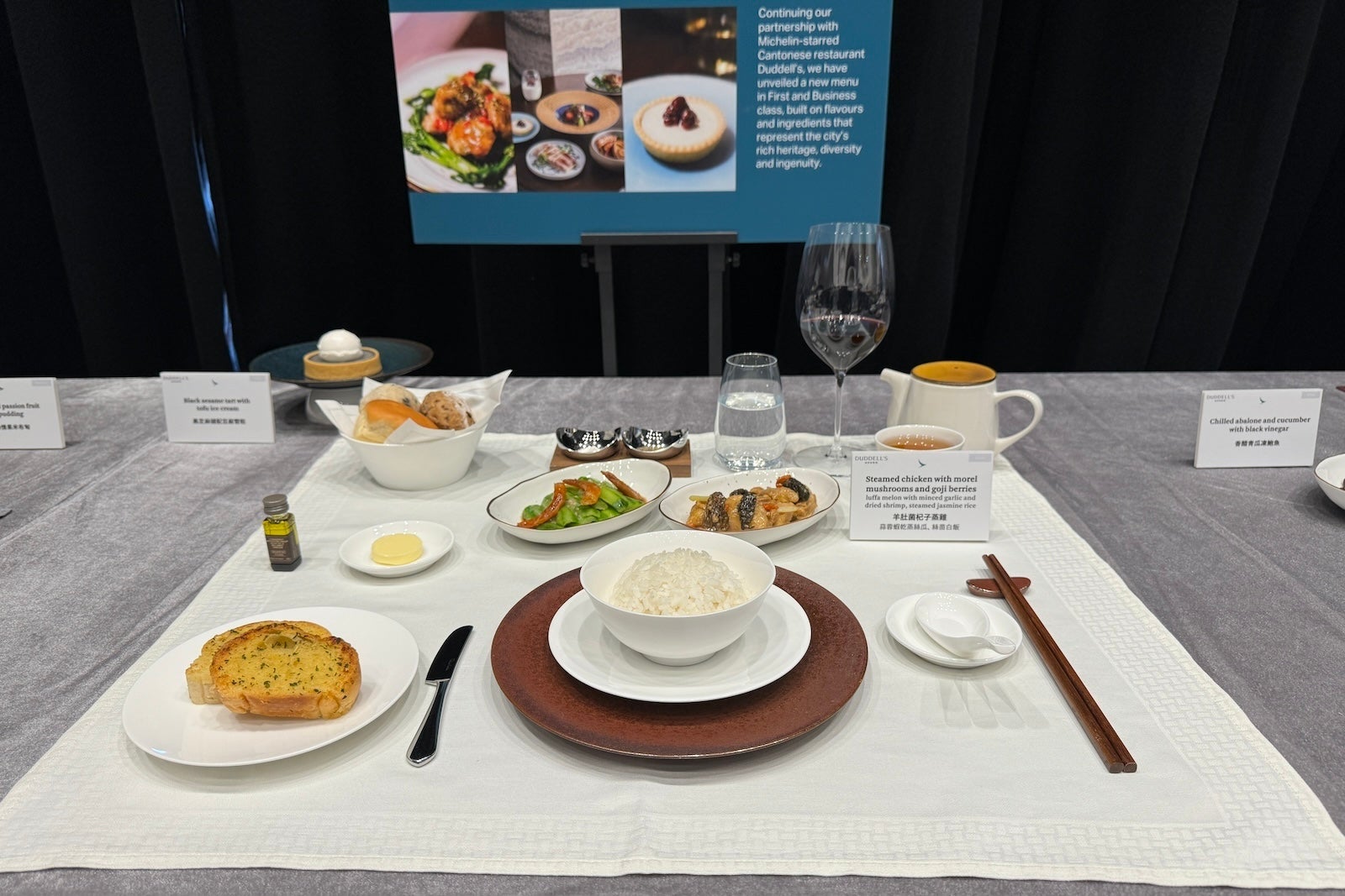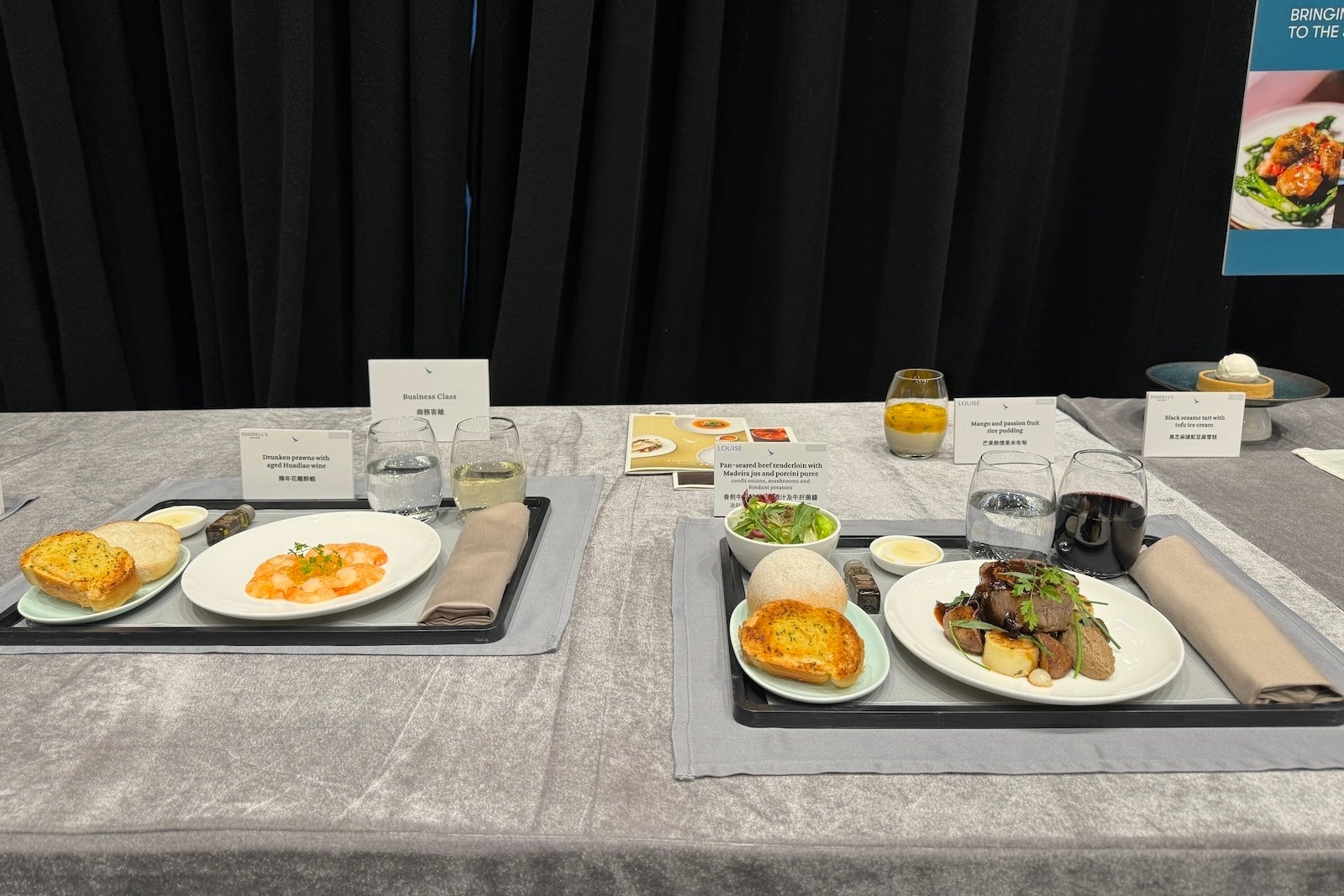 In addition to its new premium economy seats, Cathay Pacific also showcased its new and ongoing partnerships for business- and first-class meals. This includes partnerships with famous Hong Kong restaurants Duddell's and Louise — a French favorite. Among the sample dishes on display were steamed chicken with morel mushrooms and goji berries from Duddell's and pan-seared beef tenderloin with Madeira jus and porcini puree from Louise.
