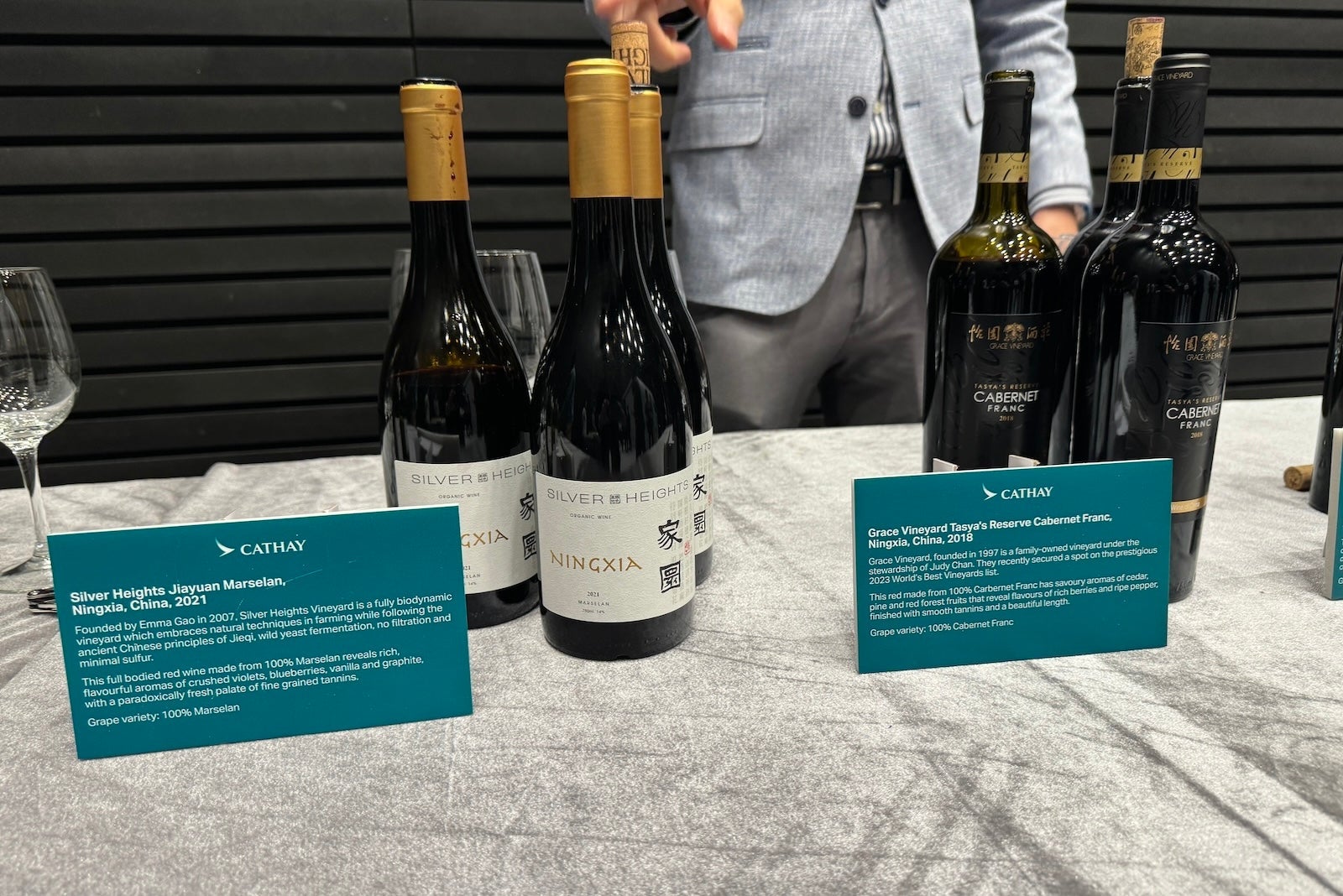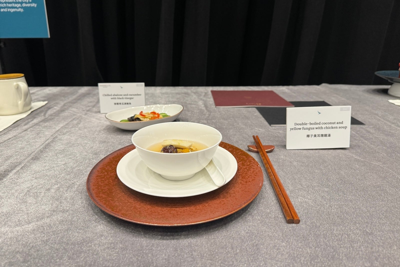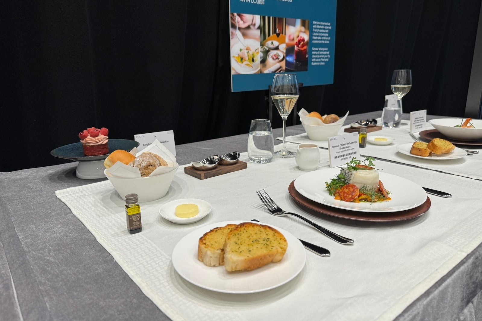 In addition to its new premium economy seats, Cathay Pacific also showcased its new and ongoing partnerships for business- and first-class meals. This includes partnerships with famous Hong Kong restaurants Duddell's and Louise — a French favorite. Among the sample dishes on display were steamed chicken with morel mushrooms and goji berries from Duddell's and pan-seared beef tenderloin with Madeira jus and porcini puree from Louise.