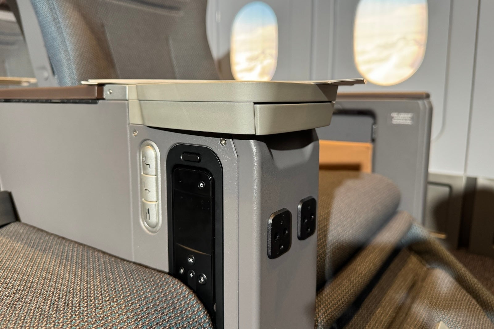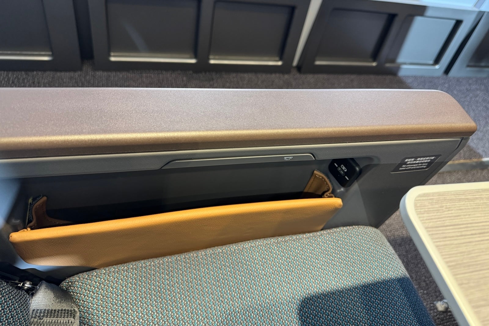 The power point and USB-A ports are embedded in the central column between pairs of seats. The USB-C port is in a small seat-side cubby; the cubby has a handy light so you can see where your phone or other belongings are.
