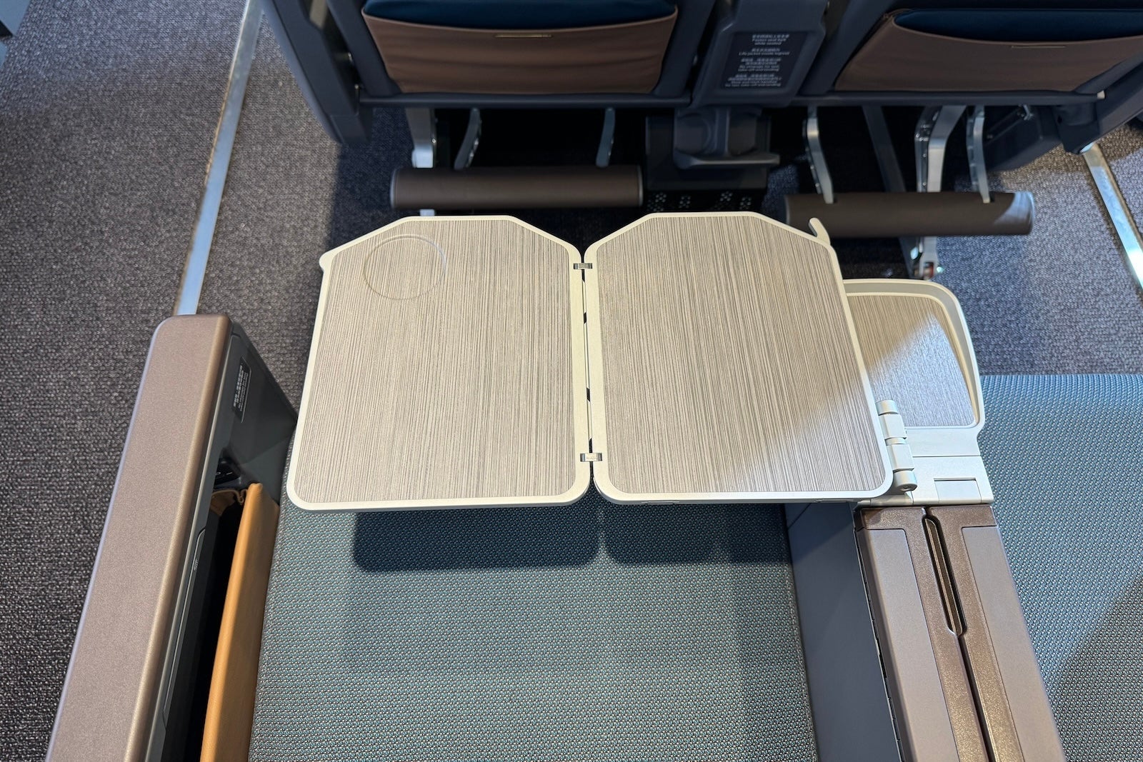 Seats have bifold tables that pull out of the armrests in addition to small drinks trays — one that's part of the armrest between neighboring seats and another that pulls out from just below this.