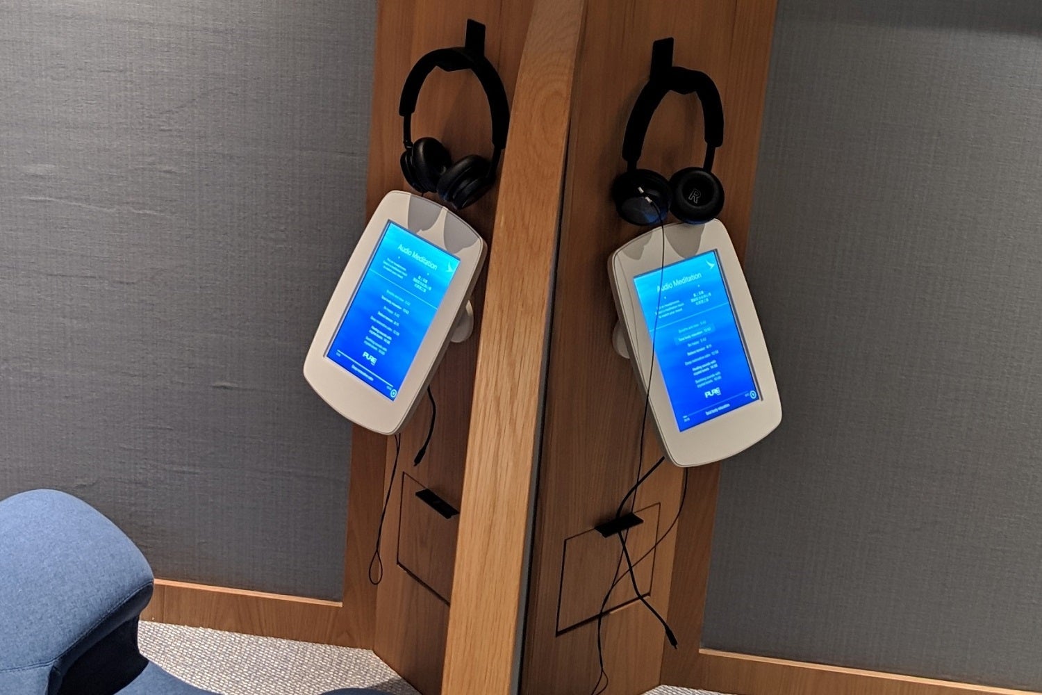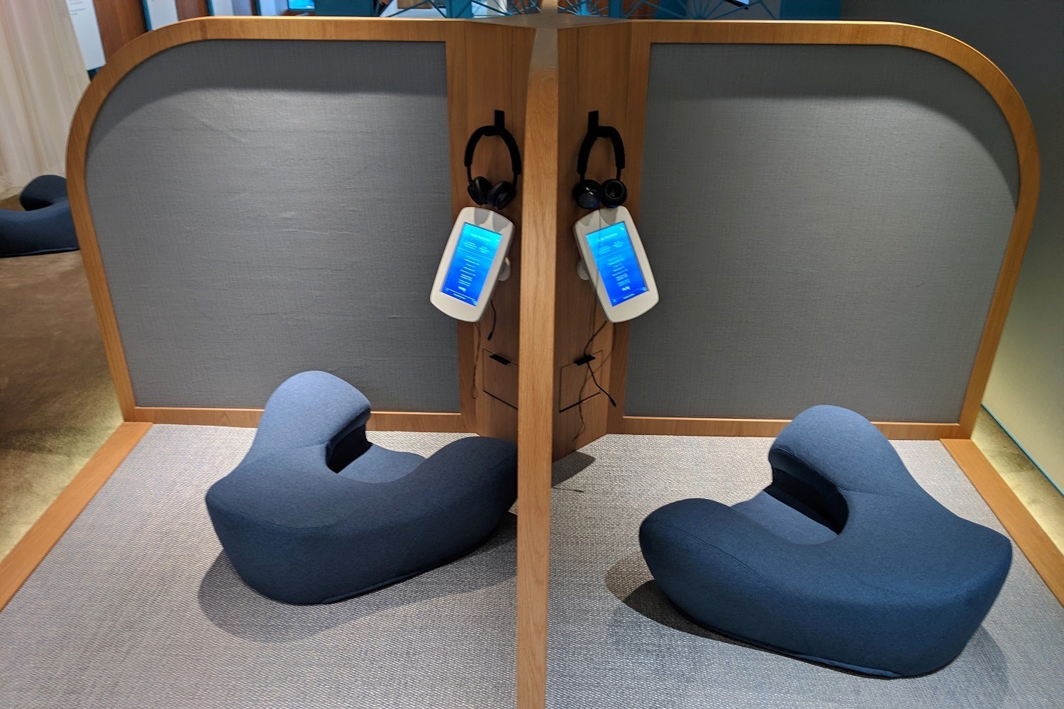 In the back right area of the space, there are four open Audio Meditation stations. Each of these areas has a pair of Bluetooth headphones, a very-comfortable Alexia Meditation Seat and a touchscreen tablet allowing guests to select from a range of audio selections, including spoken and musical meditation options. The lounge employed excellent Bang & Olufsen headphones. Understandably, these were secured to the wall to avoid passengers walking off with such an expensive item.
