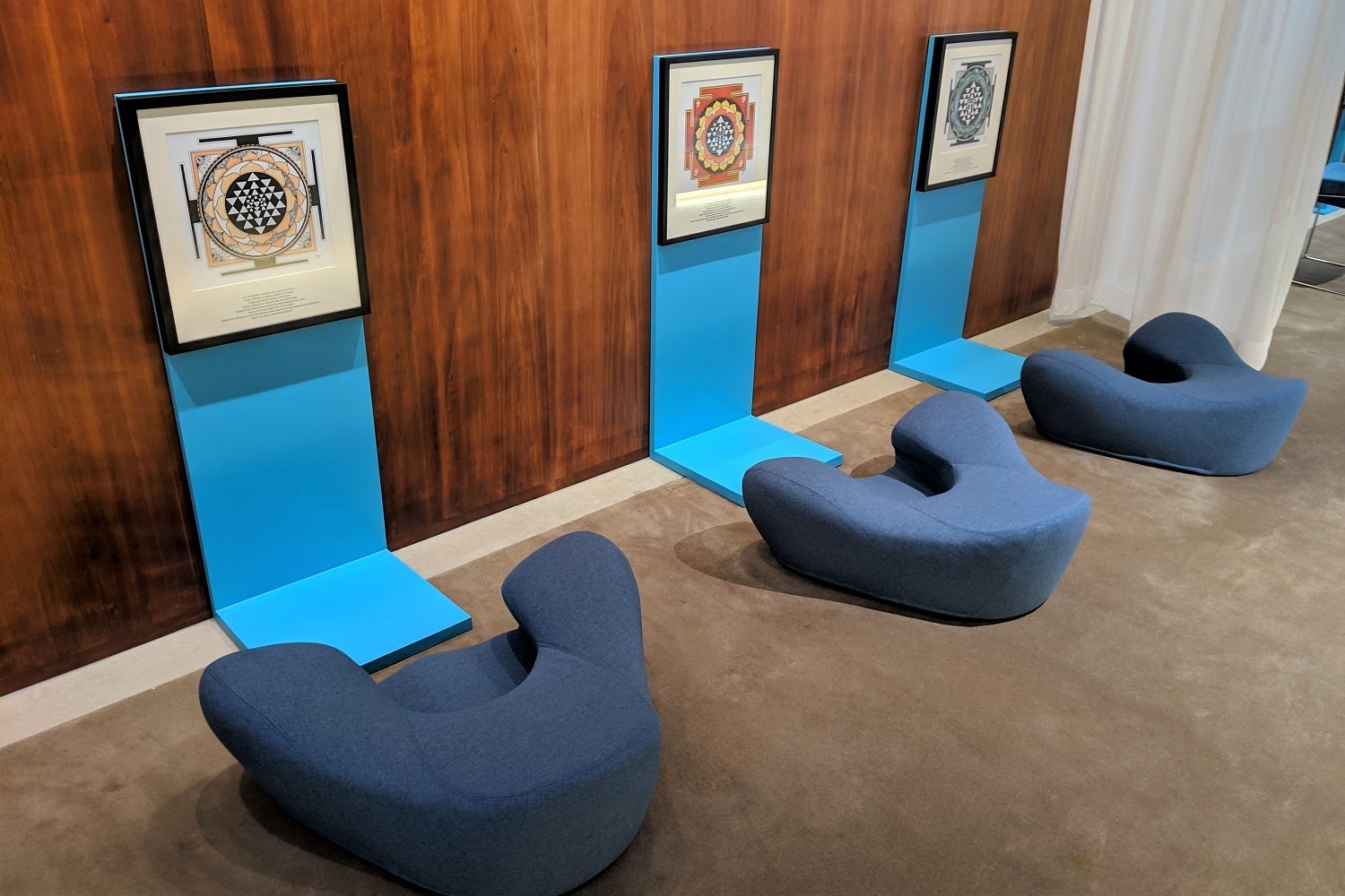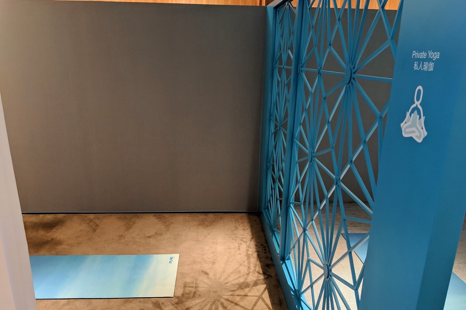 "The Sanctuary" is in the back right corner of the business class lounge. From the lounge entrance, continue toward the windows and then turn right into the open area. The signage needs to be clearer, but be aware you'll need to take off your shoes before entering the space. Inside, there are five different stations providing a range of stretching, meditation and yoga experiences, as explained on a small placard at the entrance.