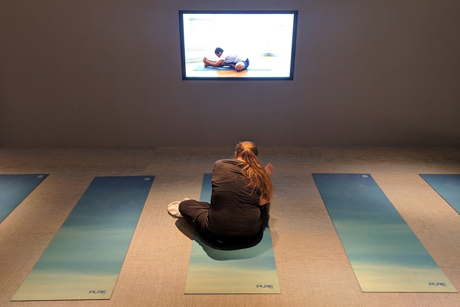 The next space is the Gentle Yoga area. This open area has five yoga mats situated in front of a TV screen with a rotating set of yoga instructional videos.