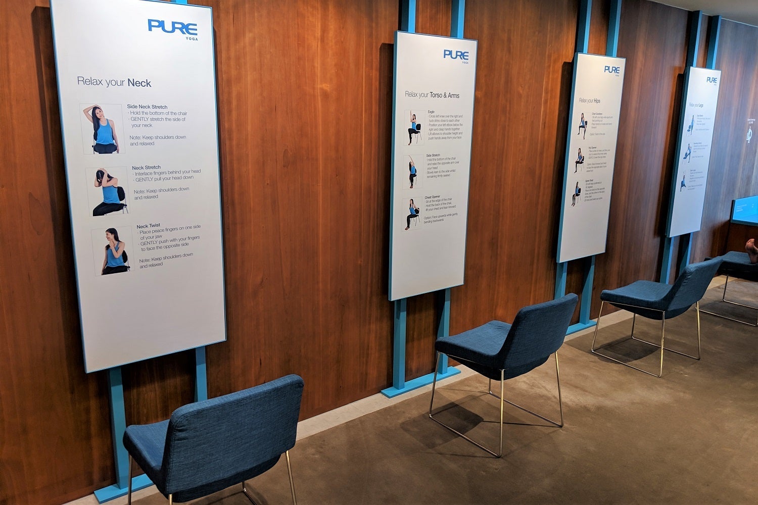 On the left as you enter the space, there's an open area of four Seated Stretching stations. Each station has three clearly-defined exercises to follow to stretch your body before your flight.