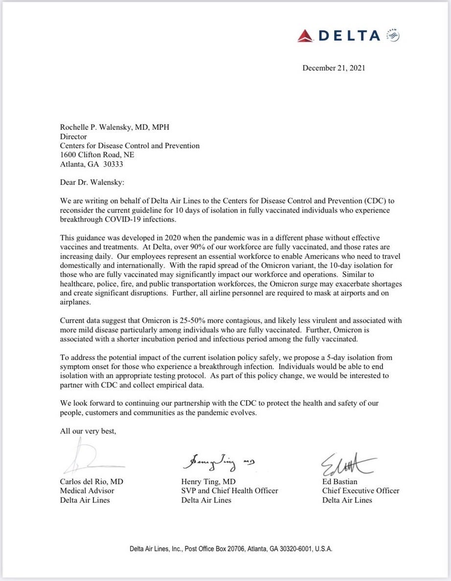 We don't think it's a coincidence that Delta, JetBlue and Airlines for America -- on Dec. 21, 22 and 23, respectively -- wrote letters to the CDC, asking the organization to reduce its 10-day isolation and quarantine rules for vaccinated individuals who test positive for COVID-19. These letters cited the effect the lengthier recommendations were having on the airlines' workforces, following a spate of canceled holiday flights that resulted from COVID-19 cases among crew. For example, here's the letter from Delta: