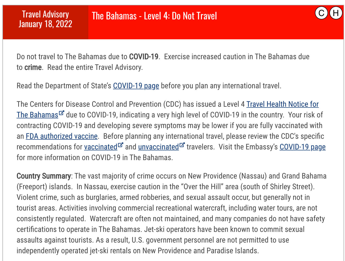 The latest advisory for the Bahamas below includes a C for crime, and H for health risks.