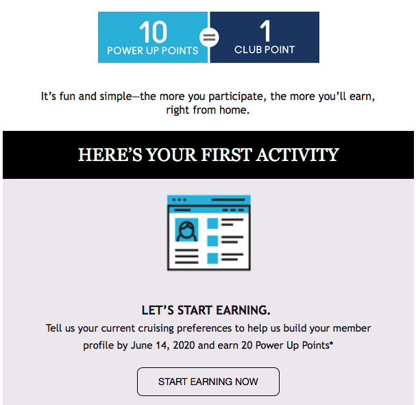 You must be signed up to receive emails from Celebrity, and whenever there is an "earning" opportunity, you'll get an email about it. Act fast since -- so far -- all of the Power Up Points-earning options have been very limited-time offers.