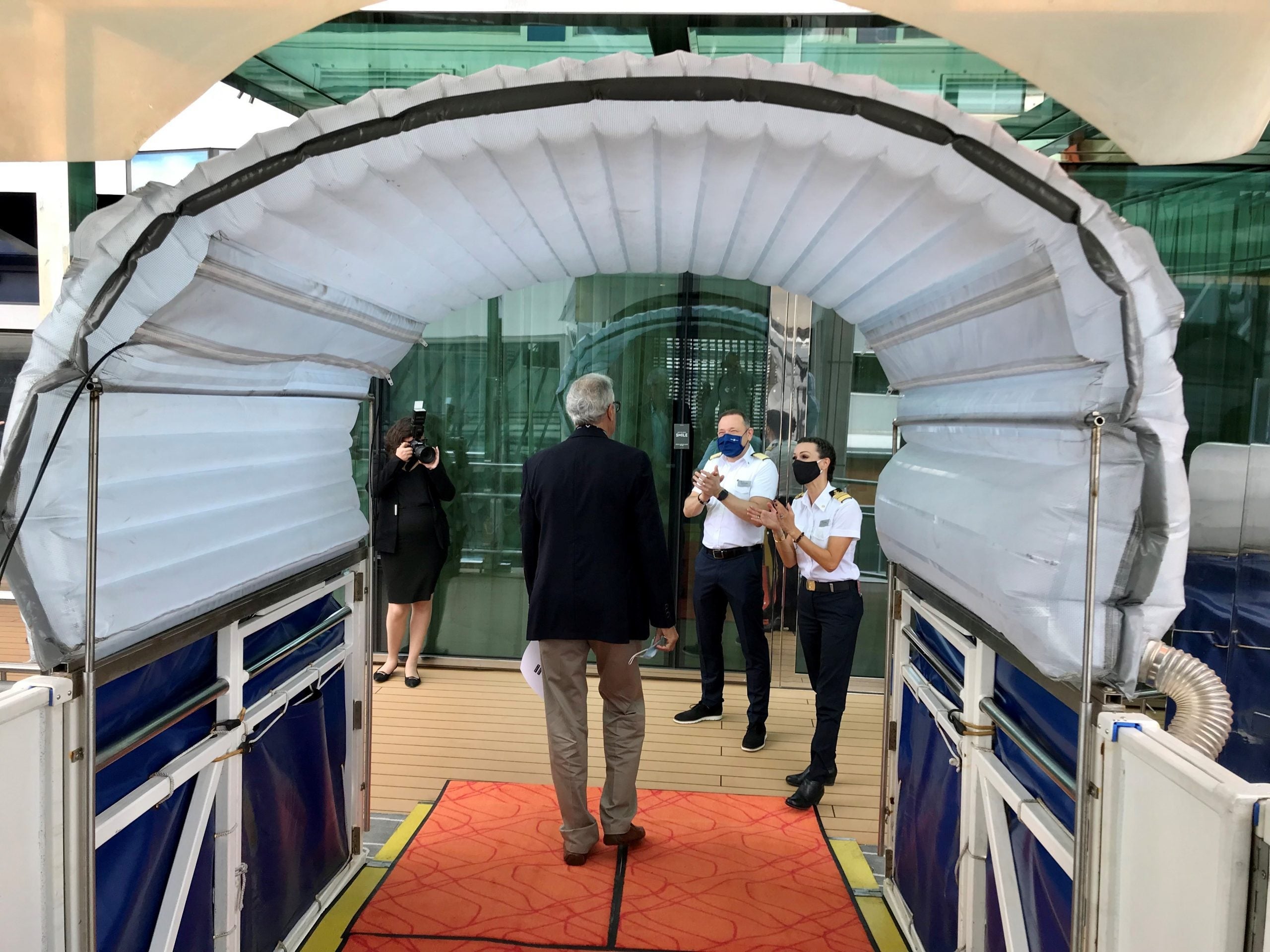 Moments later, McCue choked back tears as she recounted how Celebrity Edge had blown its horn each day while anchored offshore during the pandemic with other idled cruise vessels. They did it to let everyone know that they "were safe, healthy and happy and wishing the same for everyone that was around us, these other ships," she said.