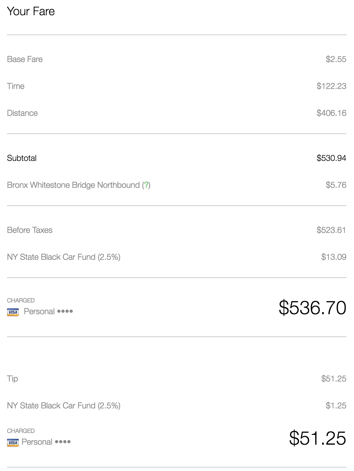 Had the ride cost $450, as had originally been confirmed, I would have been good to go — I foolishly changed the destination mid-trip, though, so our total fare was recalculated to include the 90 minutes of surprise traffic we ended up encountering along the way, bringing the total to $587.95 after tip. Still, I happily ate the extra 88 bucks and clicked through to request my check.
