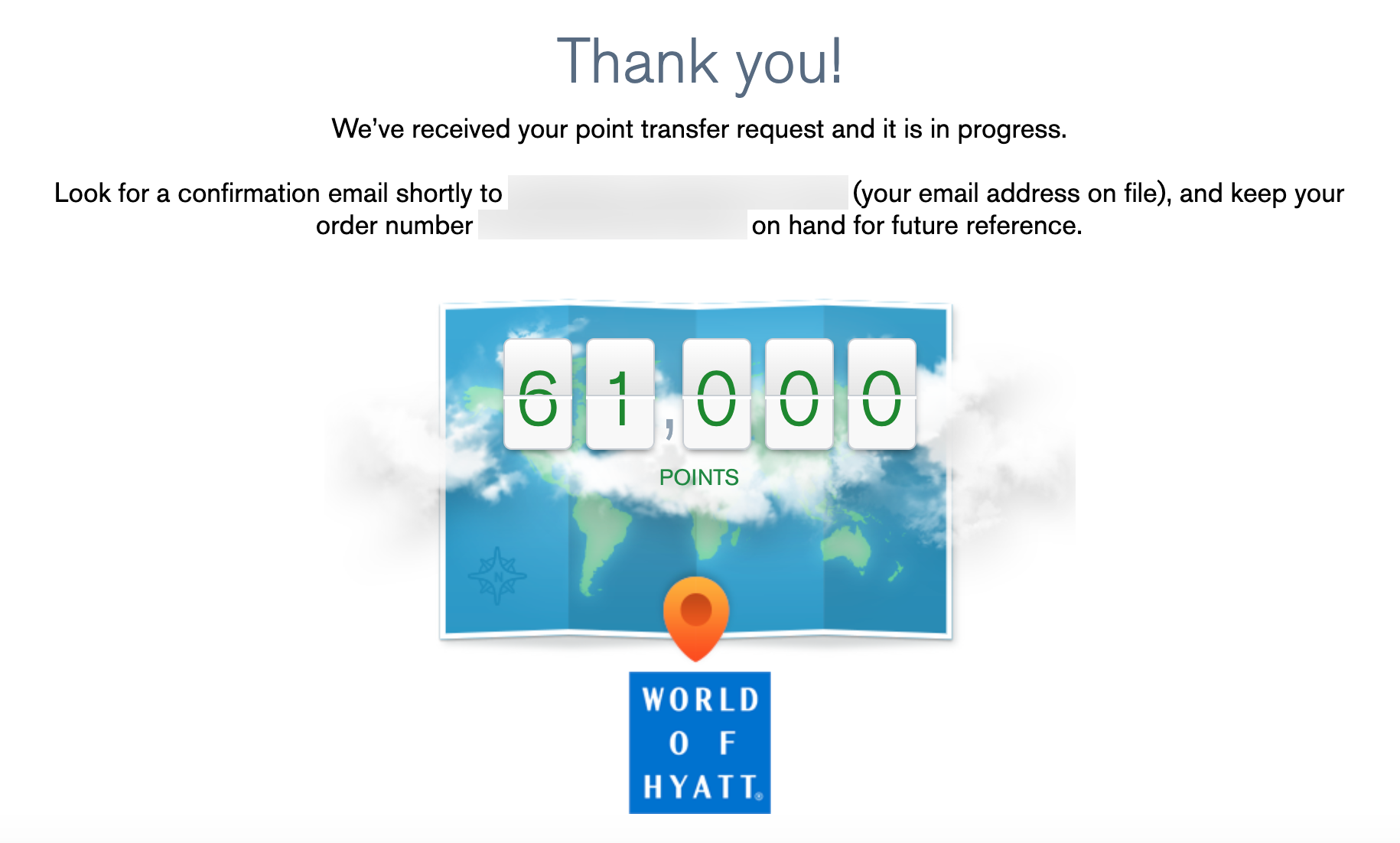 I logged into my Chase account, launched the Ultimate Rewards portal and navigated to the "Transfer to Travel Partners" section. Since I had already linked my World of Hyatt account number, it took just a few quick clicks before 61,000 Chase points where on their way to becoming Hyatt points.
