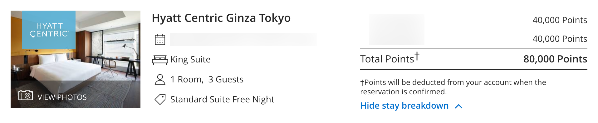 Enter Hyatt, which recently started allowing suite awards online. And a quick search through Hyatt's website landed us on the Hyatt Centric Ginza Tokyo. A standard room would be 25,000 points per night, while a suite would set us back 40,000 points per night — and give us more than double the space. Sold!
