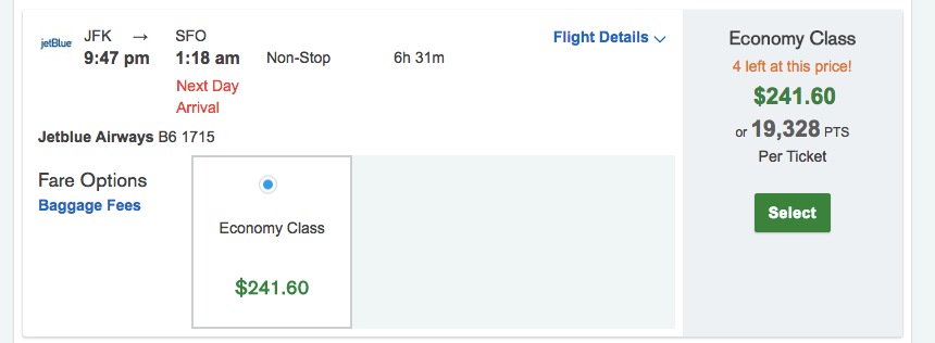 Airlines that don't offer tiered economy fares were clearly marked in the portal with just a single price option, such as this JetBlue flight from JFK to SFO for $242, the same price as Delta's basic economy fare.