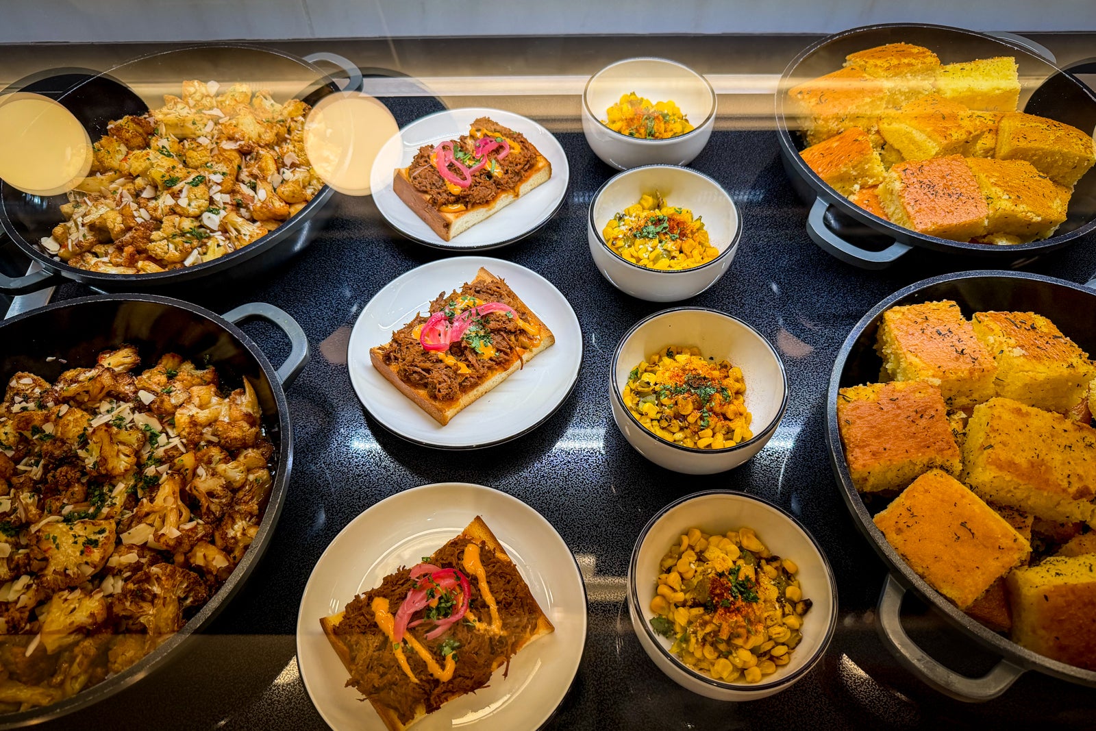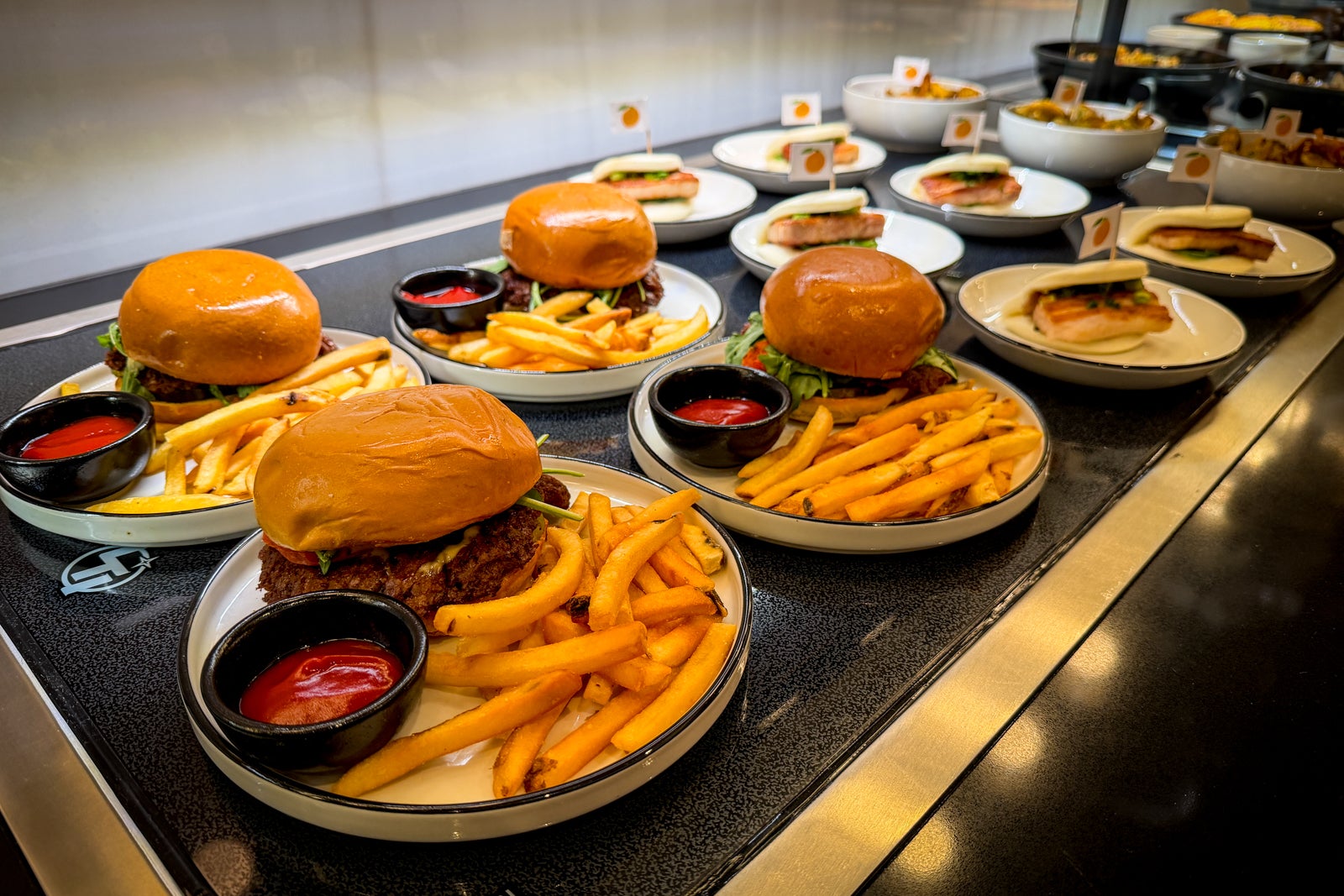 You'll find all of those options on the first-floor buffet, along with some additional made-to-order selections, such as an Impossible Burger, on the QR code menu at the cafe-style tables on the ground floor near the stairs.