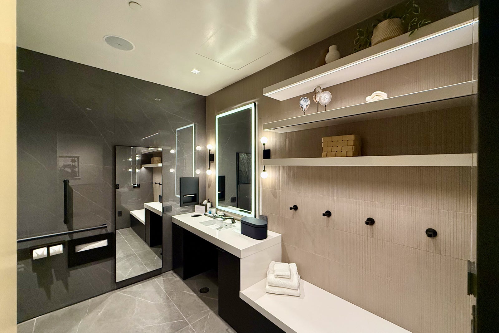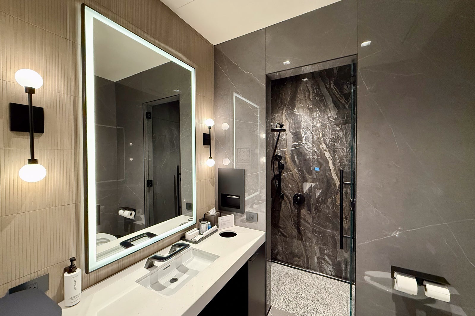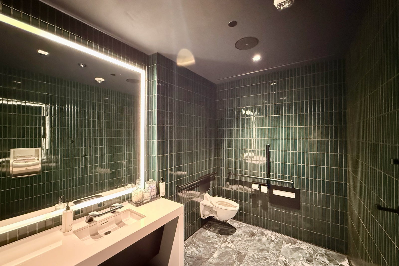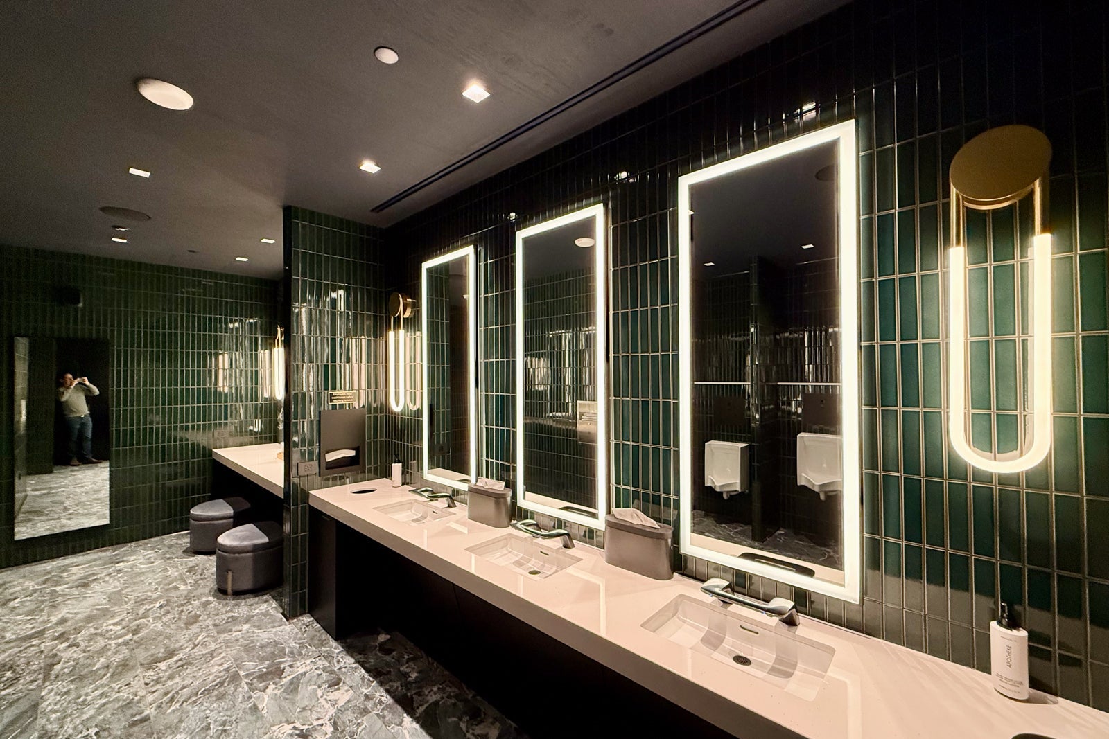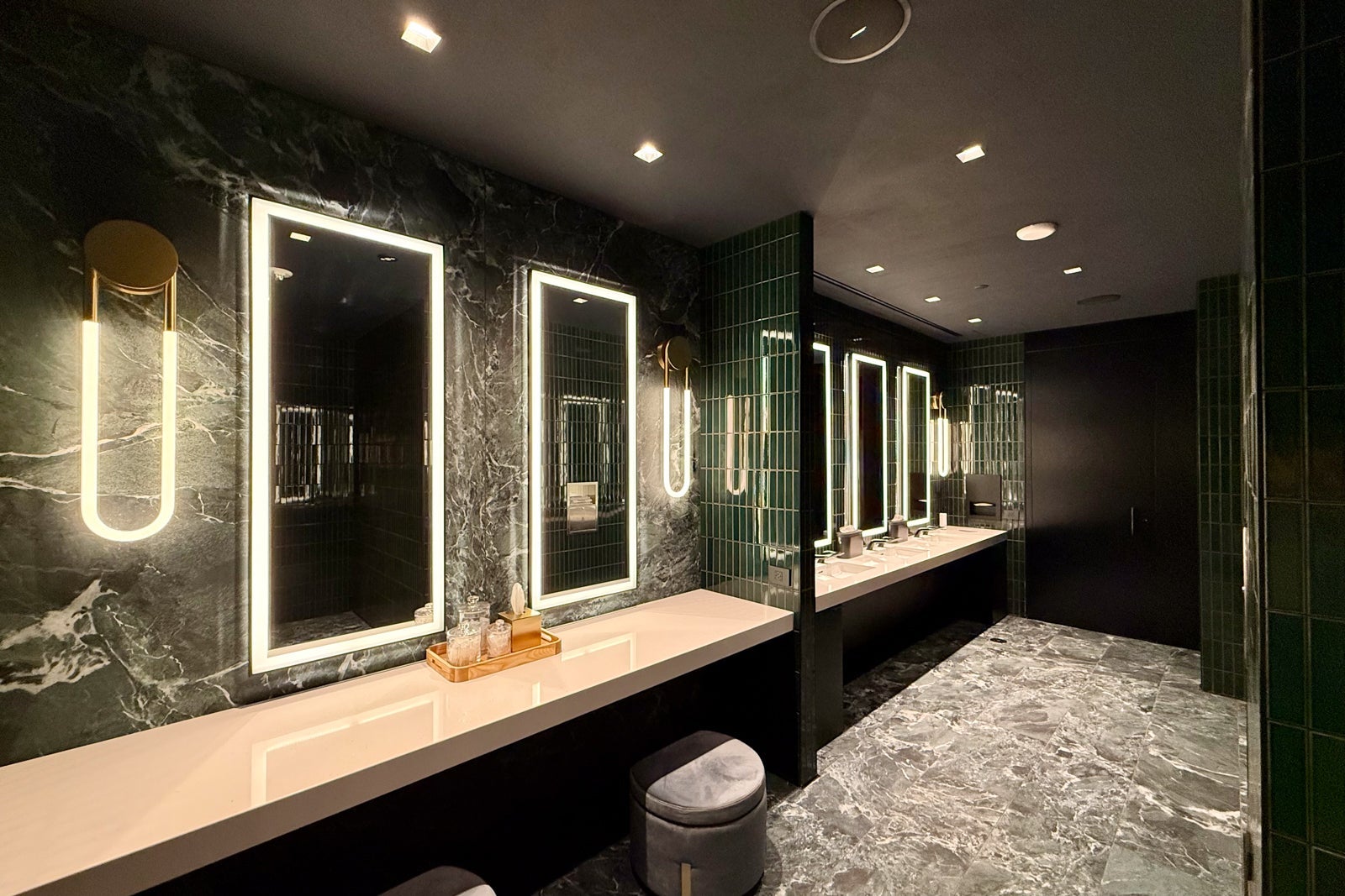 In addition to the wellness area, the lounge has one set of large restrooms lined with green marble (go Eagles!) and some eye-catching sconces.