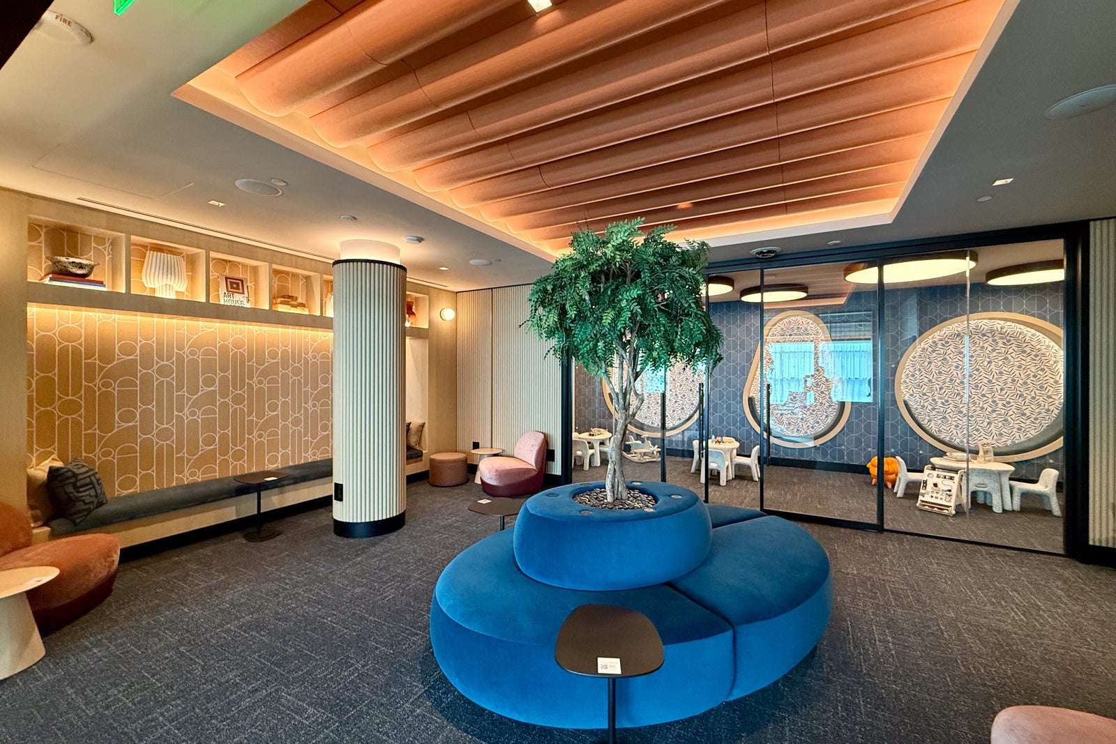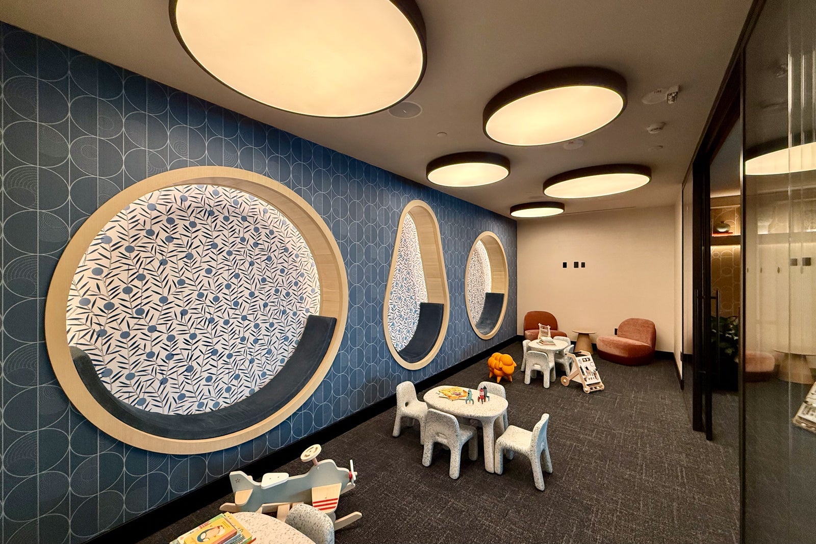The small tree in the center of this room helps add a nice touch of greenery to what's likely to be a bit of a chaotic space. Chase installed sliding glass doors to separate the play area, and it even added some toys to keep kids occupied while waiting for their flight.