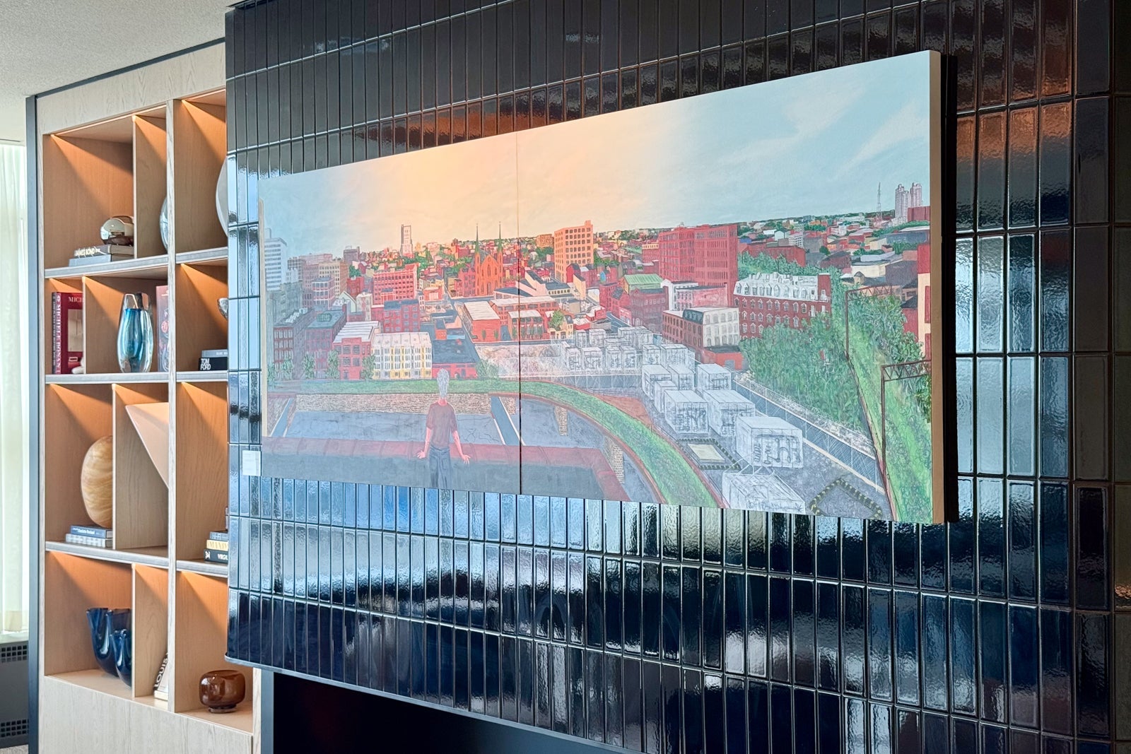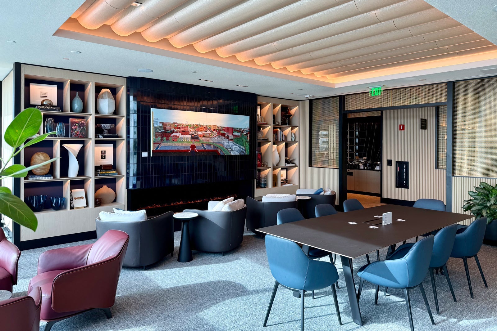 The first room is designed as a work area, with a large shared conference table and some individual recliners arranged around a faux fireplace and a colorful art piece by James Burns that's supposed to depict the vibrancy of Philadelphia.