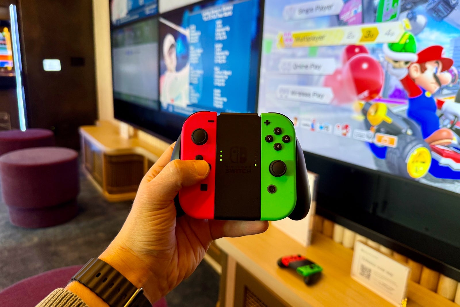 The TVs are connected to Nintendo Switch game consoles, so you can ask to play games such as Mario Kart Deluxe and NBA 2K25.