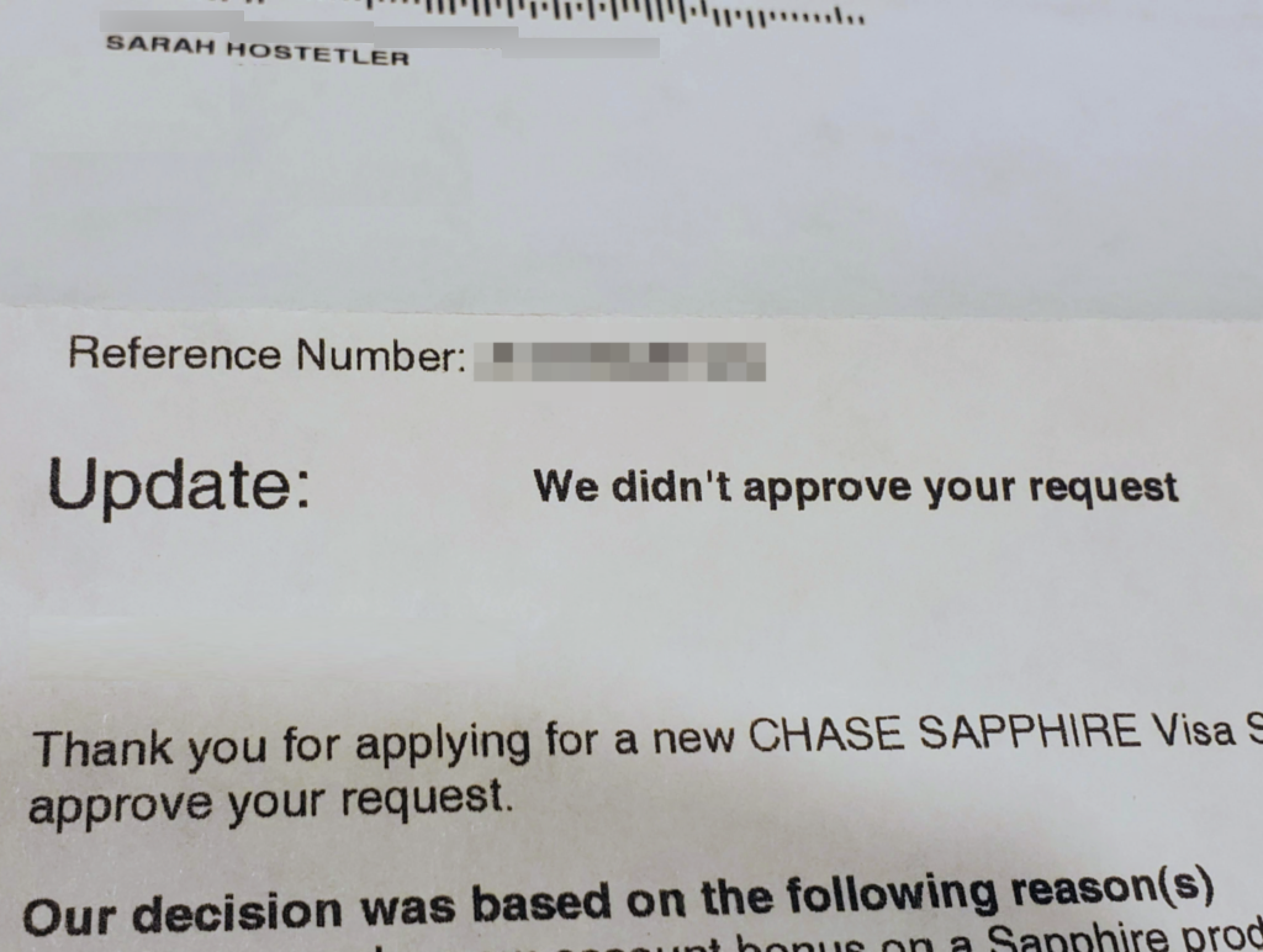 Imagine my surprise when my wife, with an excellent credit score and a low number of hard inquiries on her credit report, was instantly denied after submitting her online application to Chase. When Chase mailed us the reason, I was mortified.
