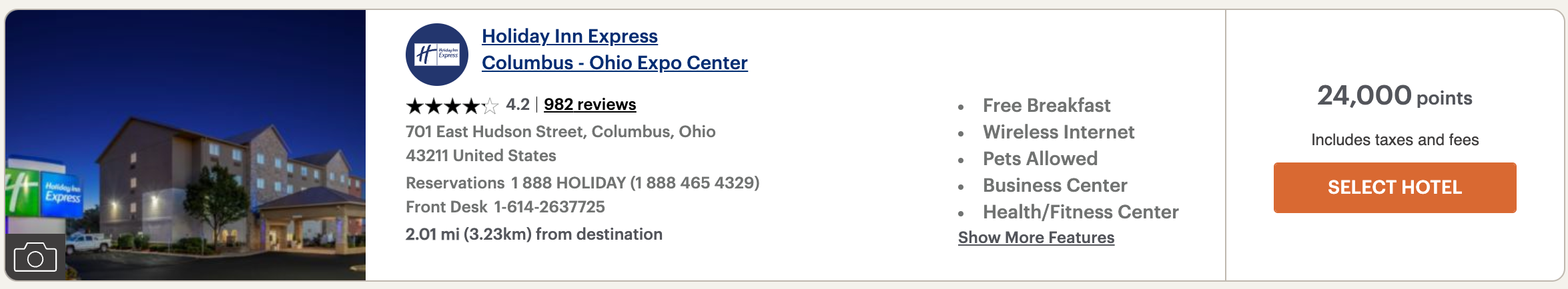 Take the Holiday Inn Express Columbus — Ohio Expo Center. You can reserve the hotel for 24,000 IHG points (or by transferring 15,000 Chase points to IHG during this transfer bonus).