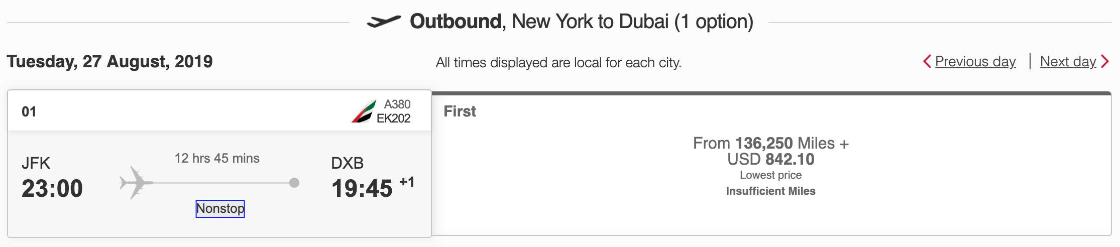 Note that in many cases, Skywards redemptions come along with some very hefty surcharges, so you could be on the hook for a significant cash co-pay, depending on your origin, destination and class of service. For example, a one-way first-class award from New York-JFK to Dubai (DXB) requires 136,250 miles plus $842. Considering that TPG values Ultimate Rewards at 2 cents each, you'd be looking at $2,725 worth of points — a total cash equivalent of just over $3,500. That's a far cry from the $15,000+ you'd need to book this same flight using cash, though.
